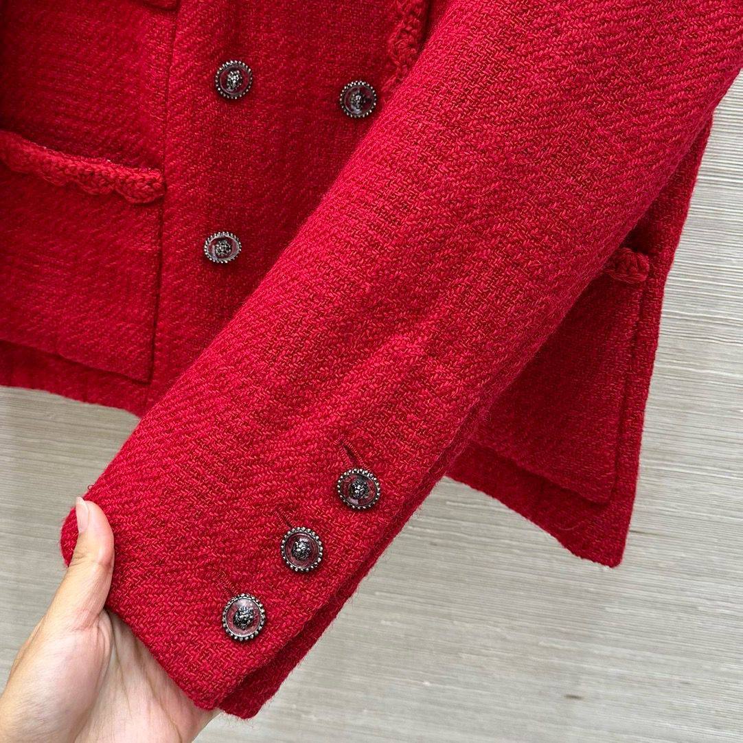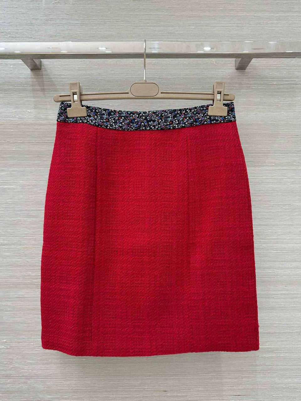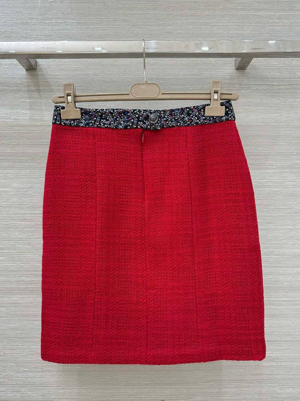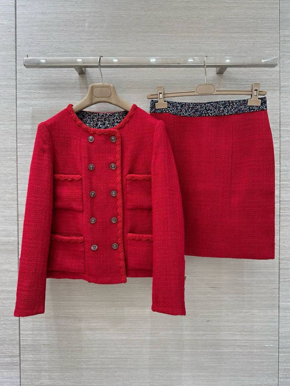 Элегантный женский костюм в стиле Chanel, состоящий из жакета и юбки. Яркий красный цвет и классический крой делают этот комплект идеальным выбором для создания изысканного образа.
