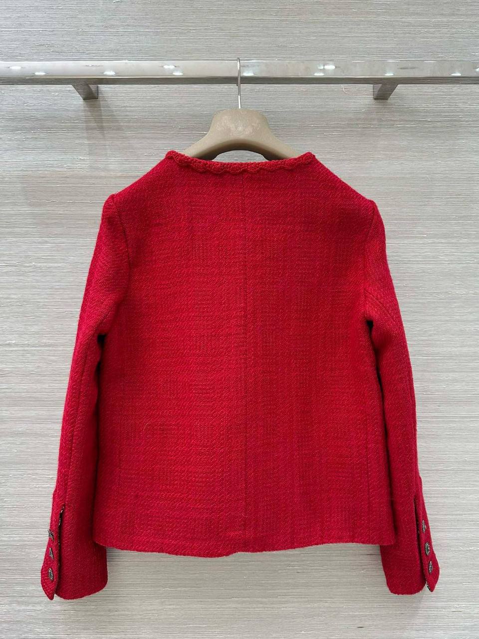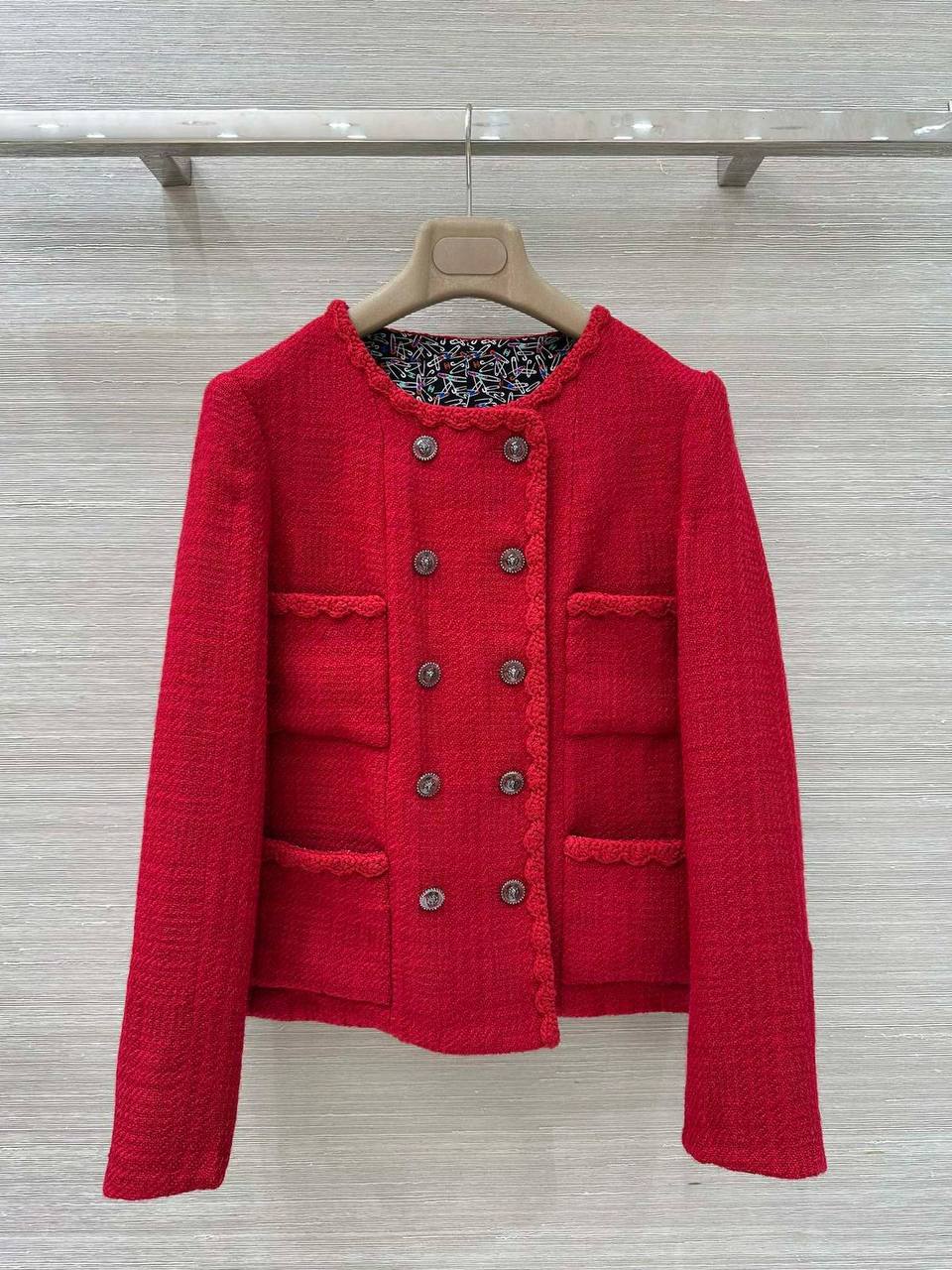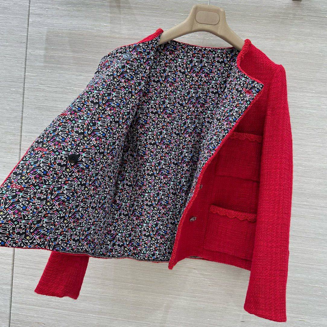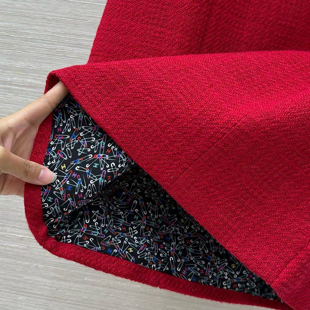 Элегантный женский костюм в стиле Chanel, состоящий из жакета и юбки. Яркий красный цвет и классический крой делают этот комплект идеальным выбором для создания изысканного образа.
