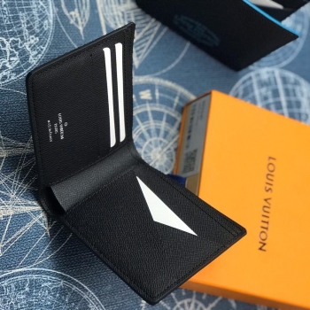 Элегантный бумажник Louis Vuitton BMS-50030 в классическом черном цвете выполнен из текстурированной кожи, что придает ему изысканный вид. Этот стильный аксессуар идеально подходит для хранения наличных денег и банковских карт.