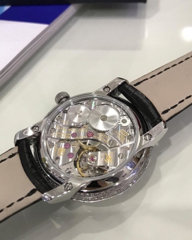 Элегантные женские часы Patek Philippe BMS-50876 представлены в классическом дизайне с перламутровым циферблатом и инкрустацией цирконами по ободку. Ремешок из черной кожи с тиснением под крокодила придает изделию изысканность, делая его идеальным аксессуаром для особых случаев и повседневного ношения.