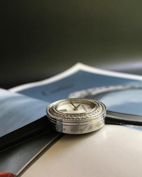 Часы женские Van Cleef BMS-55764 в классическом стиле, с циферблатом цвета слоновой кости и изящным черным ремешком. Круглый корпус, инкрустированный сверкающими камнями, и подвеска в виде клевера придают часам особый шик, делая их идеальным аксессуаром для элегантных образов.