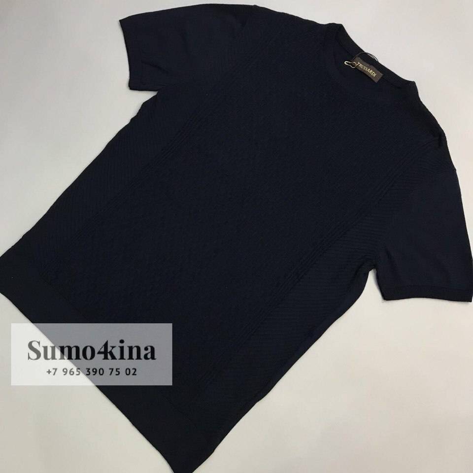 Темно-синяя футболка odm-1118 от Trussardi — стильный и универсальный элемент мужского гардероба. Модель с коротким рукавом и фактурным узором идеально подойдет для создания как повседневных, так и более элегантных образов.
