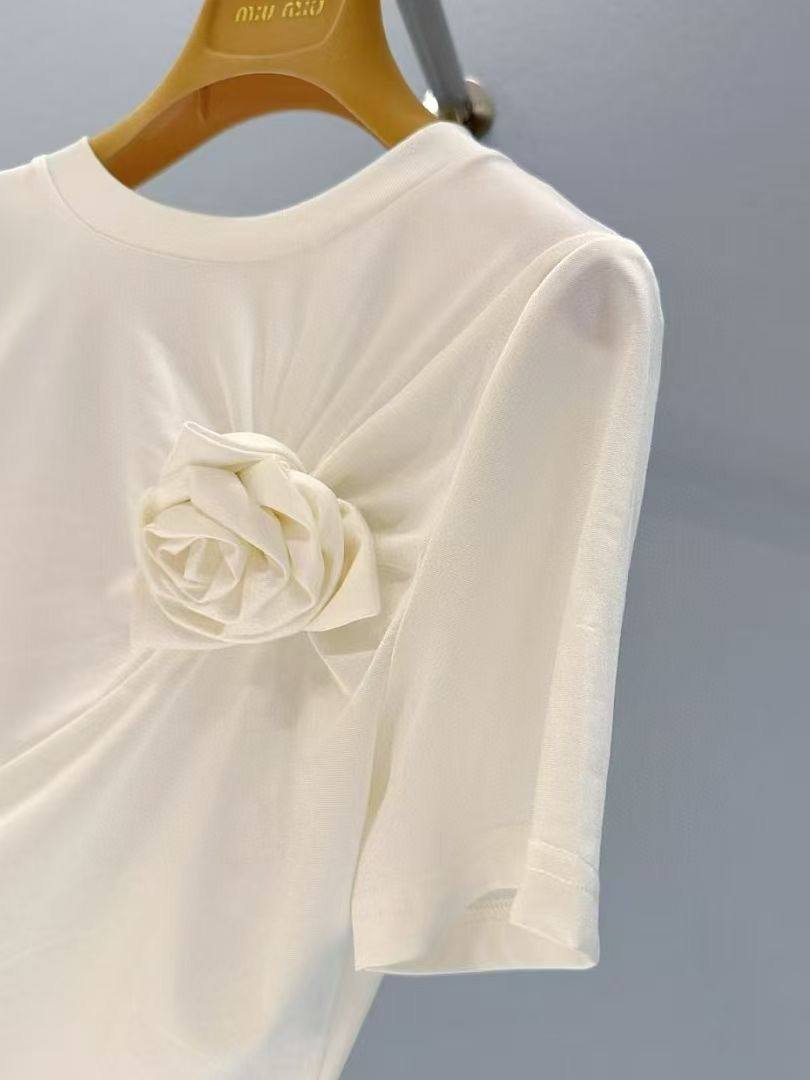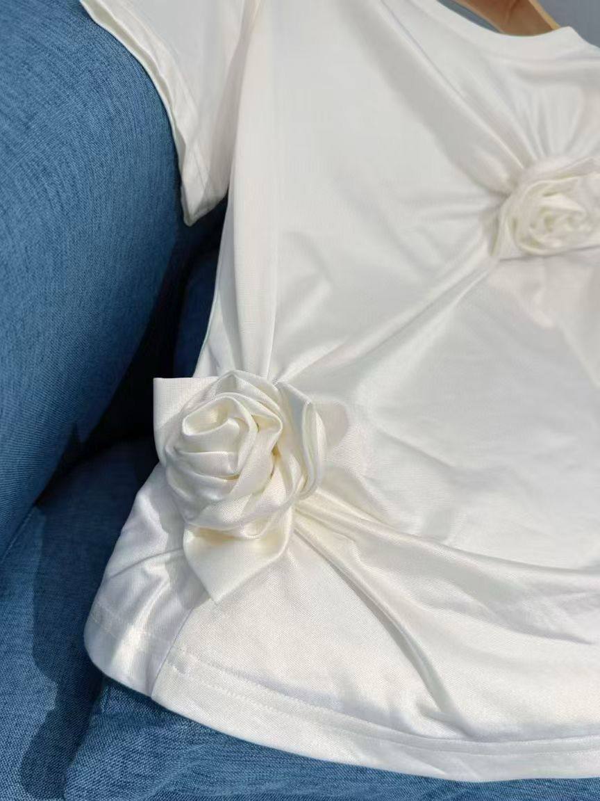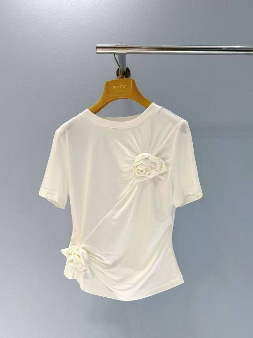 Футболка BMS-155957 - стильная и женственная модель, которая добавит изысканности в ваш гардероб. Отличается оригинальным дизайном с декоративными элементами в виде цветов. Идеально подходит для создания элегантных образов.