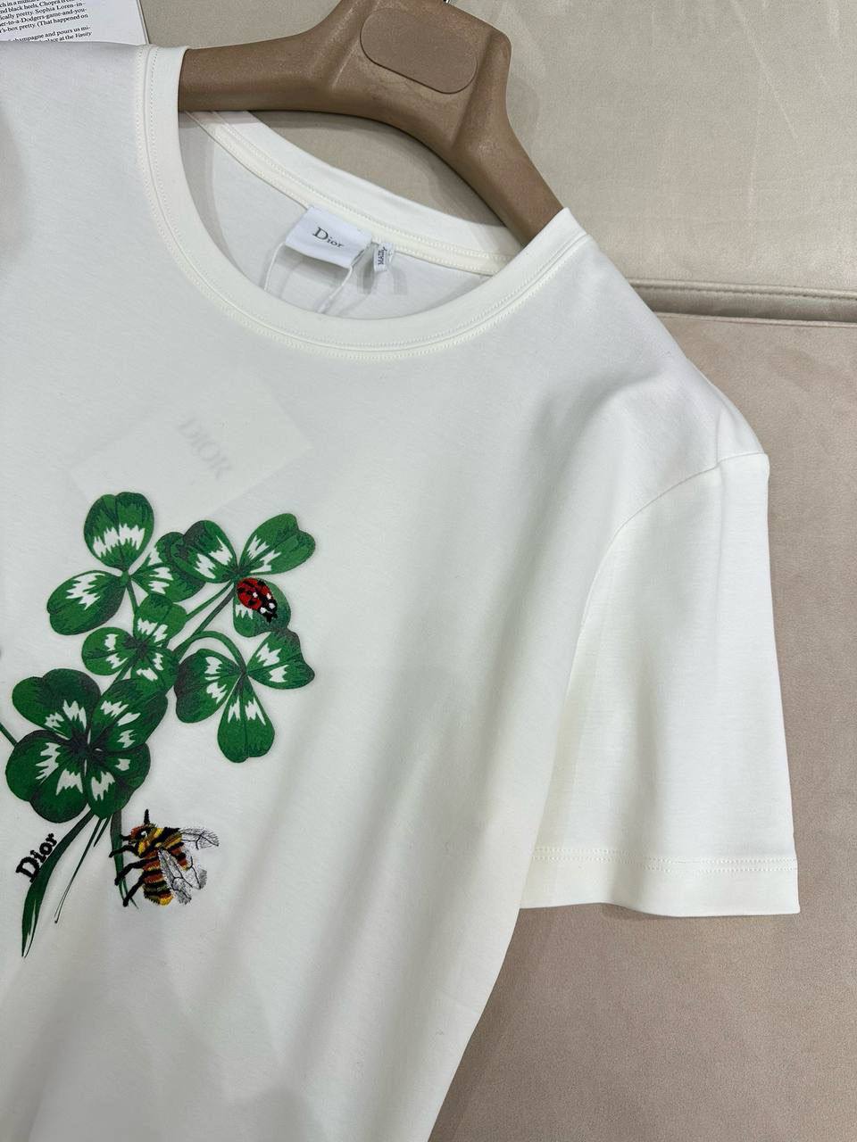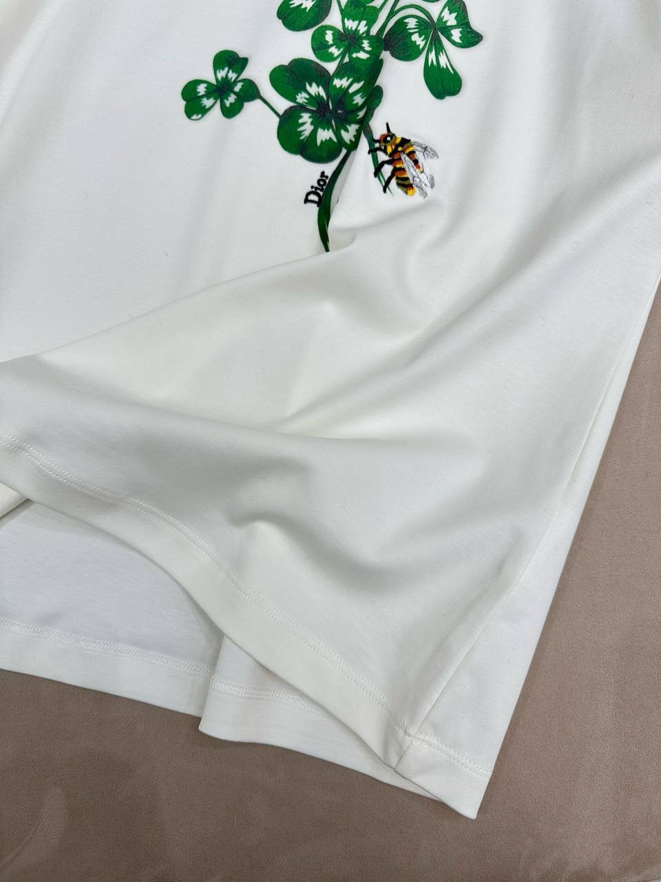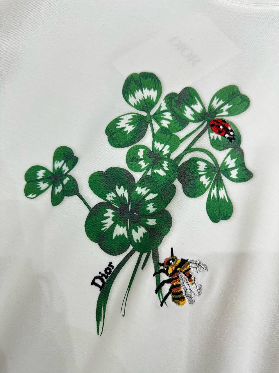 На изображении представлена стильная футболка Christian Dior с оригинальным принтом в виде четырехлистного клевера. Эта футболка - воплощение элегантности и изысканности в повседневном гардеробе.