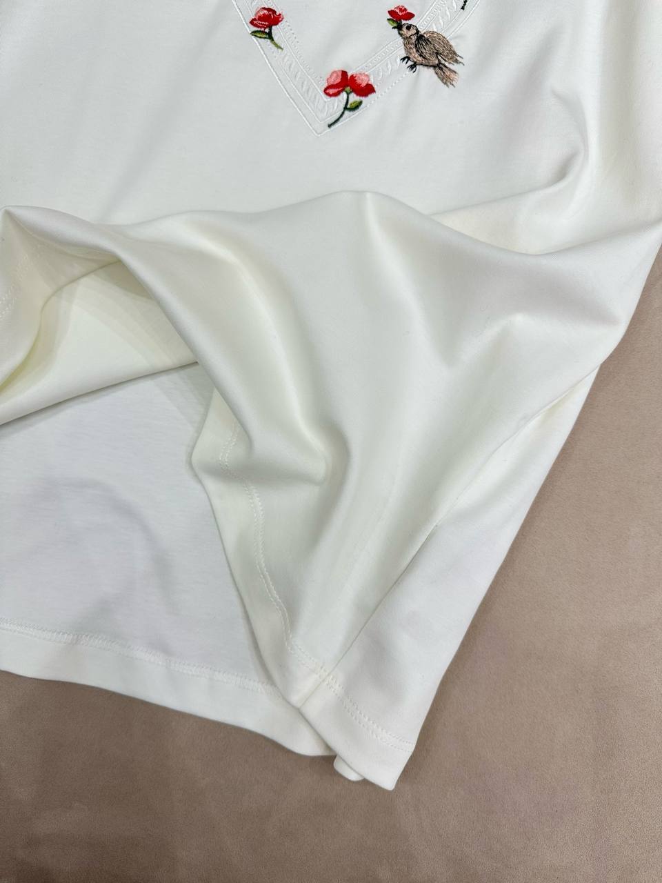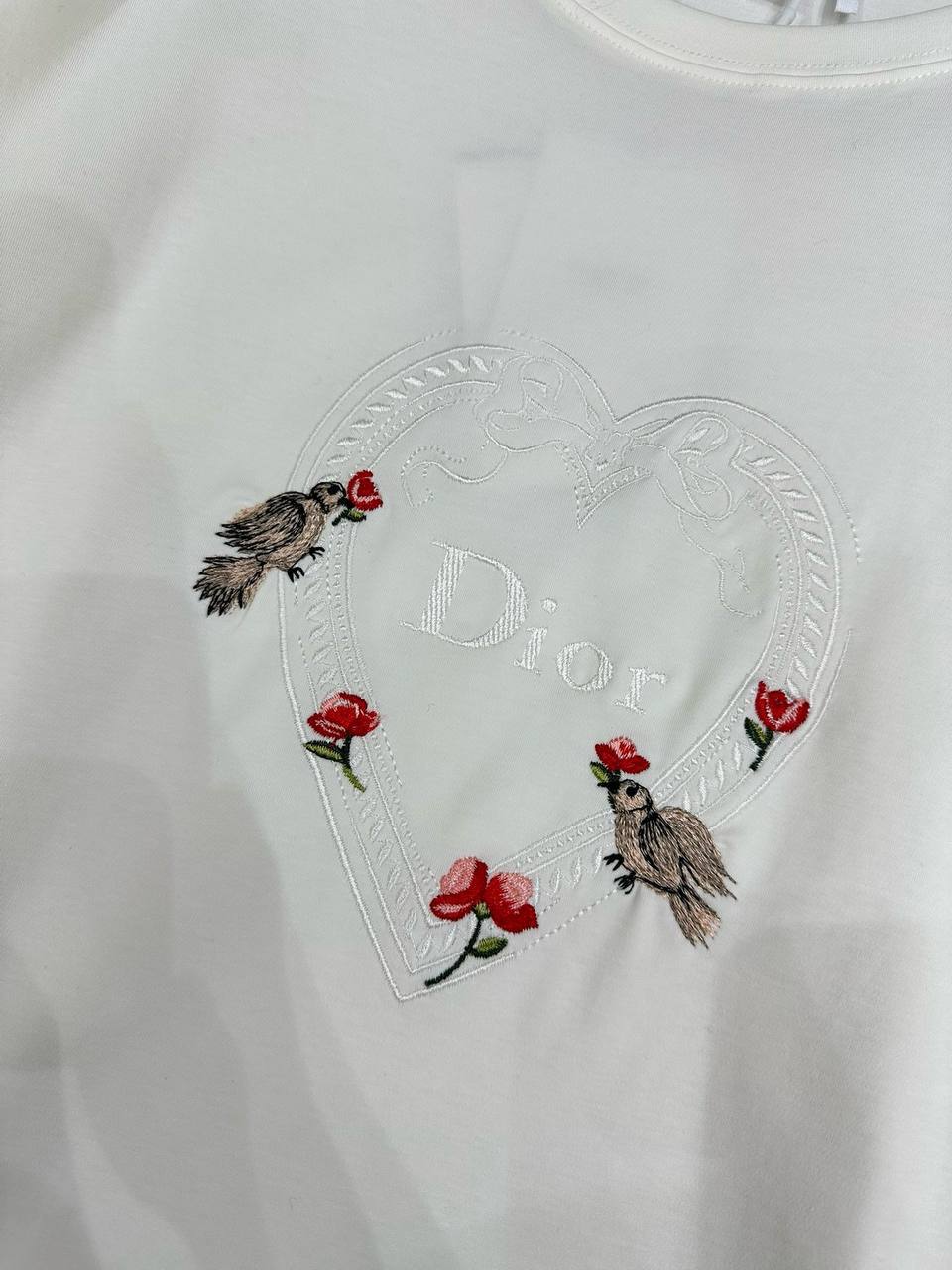 Футболка Christian Dior BMS-154111 – это элегантный предмет гардероба, сочетающий в себе классический крой и изысканный дизайн. Она выполнена в нежном белом цвете и украшена оригинальной вышивкой в виде сердца с логотипом Dior, цветов и птиц.