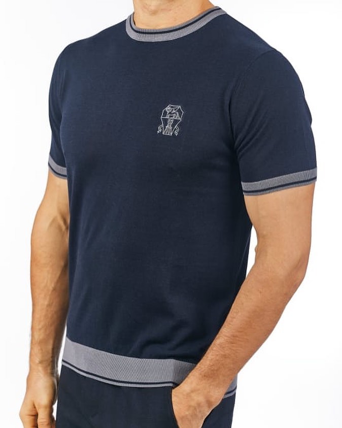 Классическая темно-синяя футболка мужская BMS-68152 от бренда Brand-msk.ru с контрастной отделкой по горловине, манжетам и низу изделия. Лаконичный дизайн с небольшим логотипом на груди делает эту модель универсальной для создания повседневных и более формальных образов.