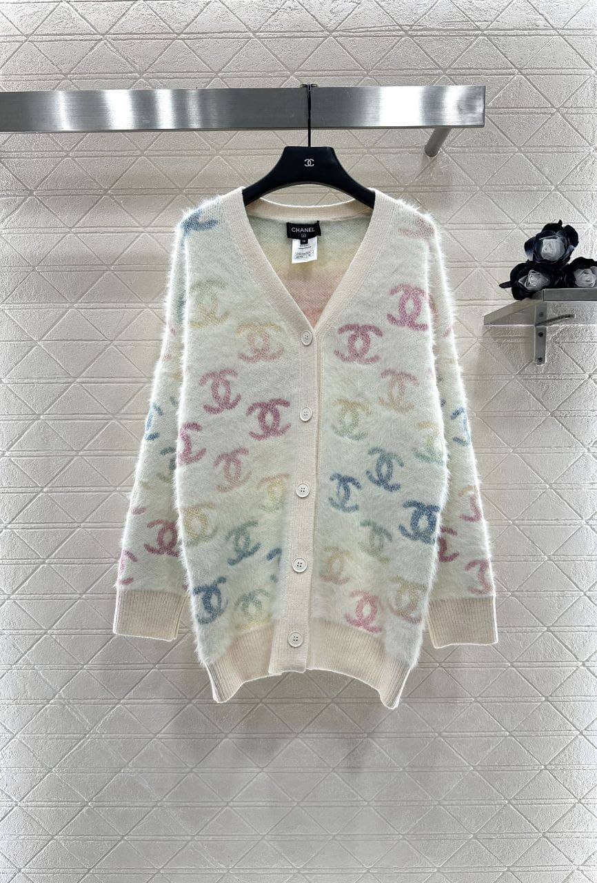 Кардиган Chanel BMS-153230 – это стильный и женственный предмет гардероба. Изделие выполнено в светлых тонах и украшено разноцветными логотипами бренда, что добавляет ему оригинальности и шарма.