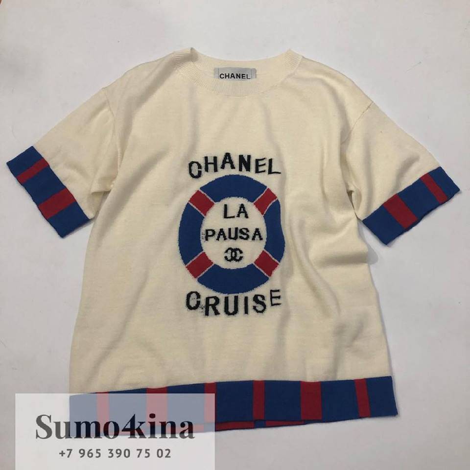 Кофта женская Chanel BMS-28838 выполнена в кремовом цвете с контрастной отделкой на рукавах и по низу изделия, имитирующей матросскую полоску. Крупная аппликация с надписями "CHANEL", "LA PAUSA", "CRUISE" и символом бренда в виде спасательного круга придает изделию спортивный и узнаваемый стиль. Эта модель идеально подойдет для создания стильных повседневных образов.