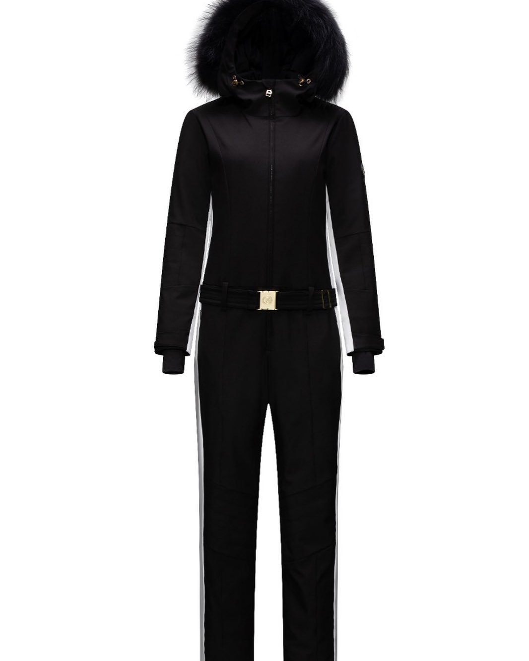 Элегантный черный комбинезон Bogner BMS-61328 с контрастными белыми полосами по бокам, капюшоном, отделанным мехом, и стильным поясом, идеально подойдет для активного зимнего отдыха.
