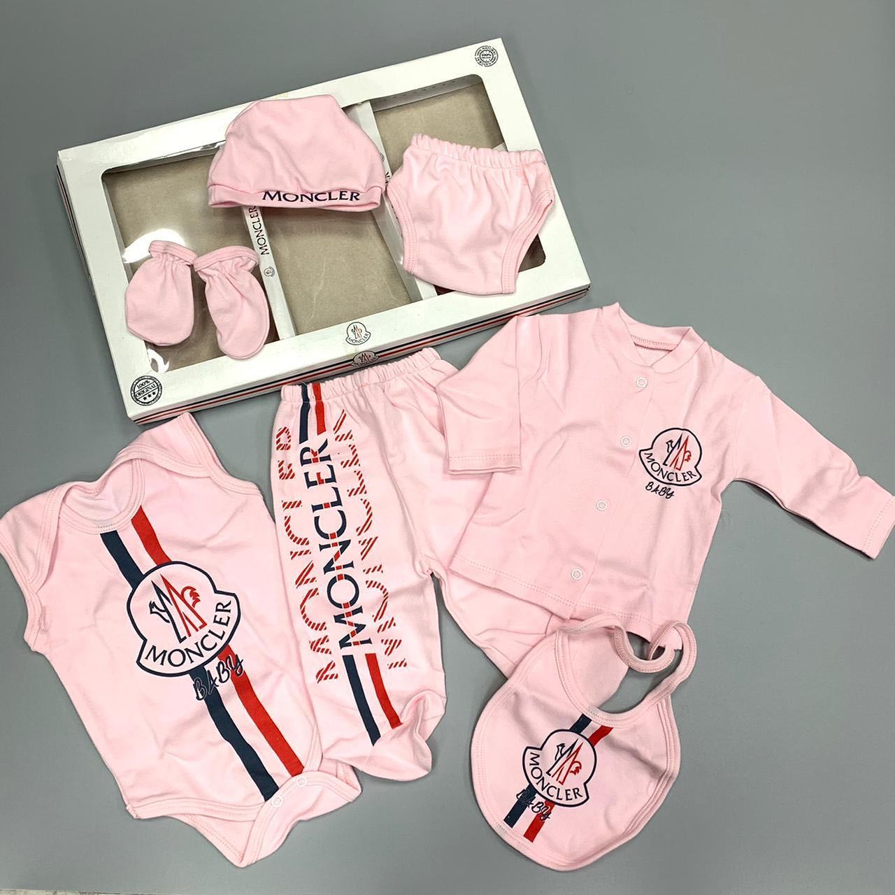 Комплект Moncler BMS-69865 для новорожденных - это нежный и стильный набор, выполненный в светло-розовых тонах. Комплект включает боди, штанишки, комбинезон, слюнявчик, шапочку и пинетки, украшенные узнаваемым логотипом бренда и полосками в цветах бренда. Это идеальный вариант для комфорта и создания модного образа малыша с первых дней жизни.