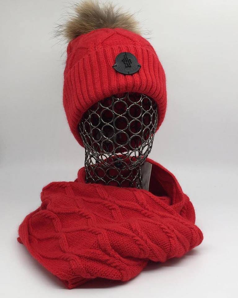 Комплект Moncler BMS-28643 представляет собой стильный зимний аксессуар, выполненный в ярком красном цвете. Вязаная шапка с объемным помпоном и фактурный шарф создают уютный и модный образ, идеально подходящий для холодной погоды.