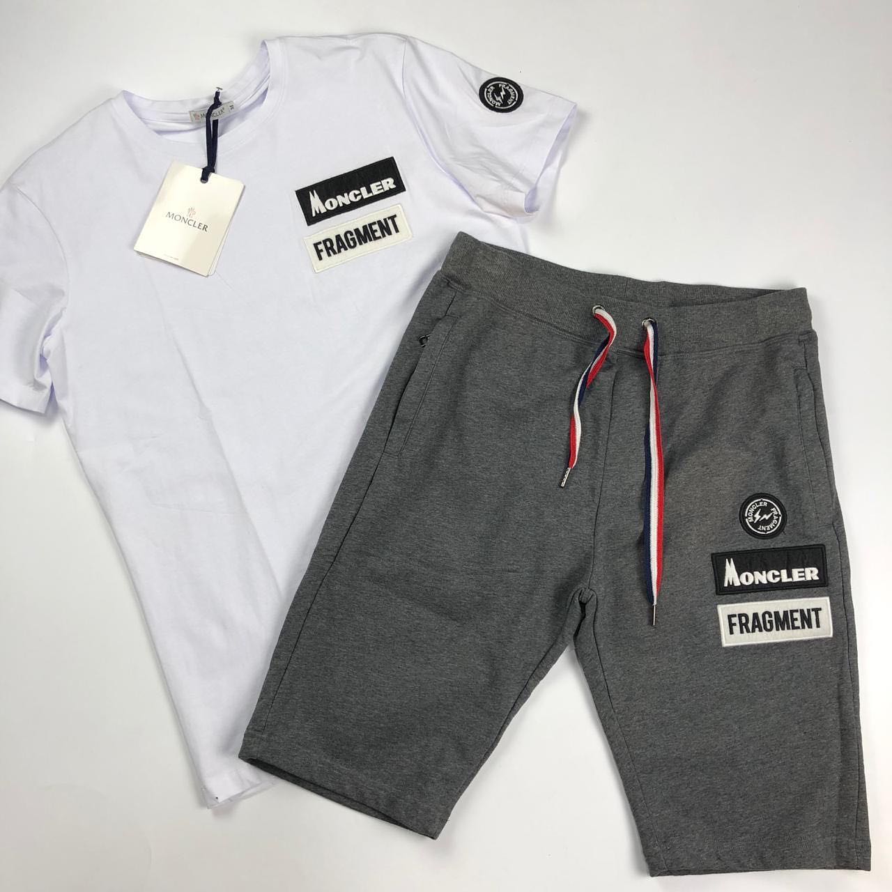 Представленный мужской костюм Moncler BMS-56766, состоящий из белой футболки и серых шорт, выполнен в современном спортивном стиле. Детали с контрастными надписями "MONCLER FRAGMENT" и круглым логотипом бренда подчеркивают его эксклюзивность. Этот костюм идеально подходит для повседневного ношения, обеспечивая комфорт и стильный внешний вид.