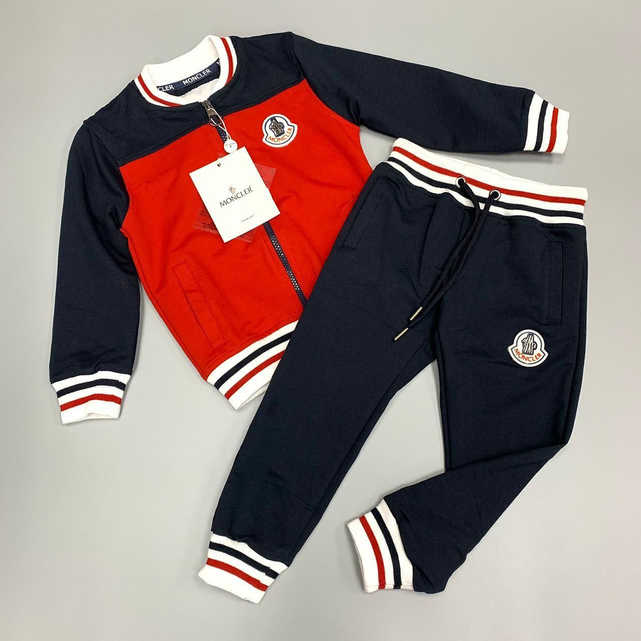 Костюм спортивный Moncler BMS-68250 представляет собой стильный комплект из куртки и брюк, выполненный в спортивном стиле. Сочетание красного и темно-синего цветов, а также контрастные полосы на манжетах и поясе придают ему современный вид.