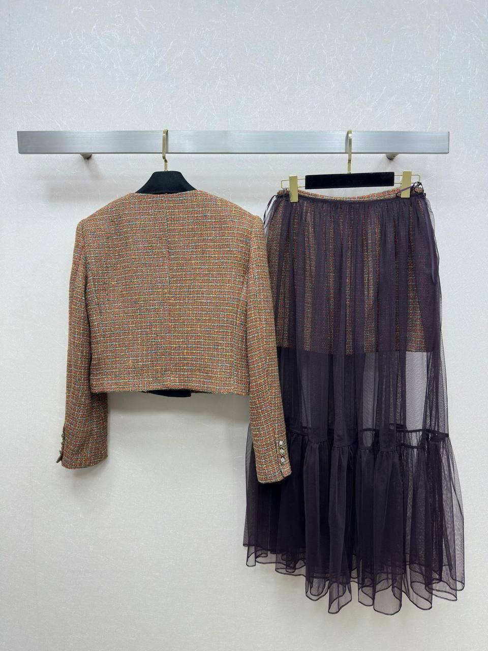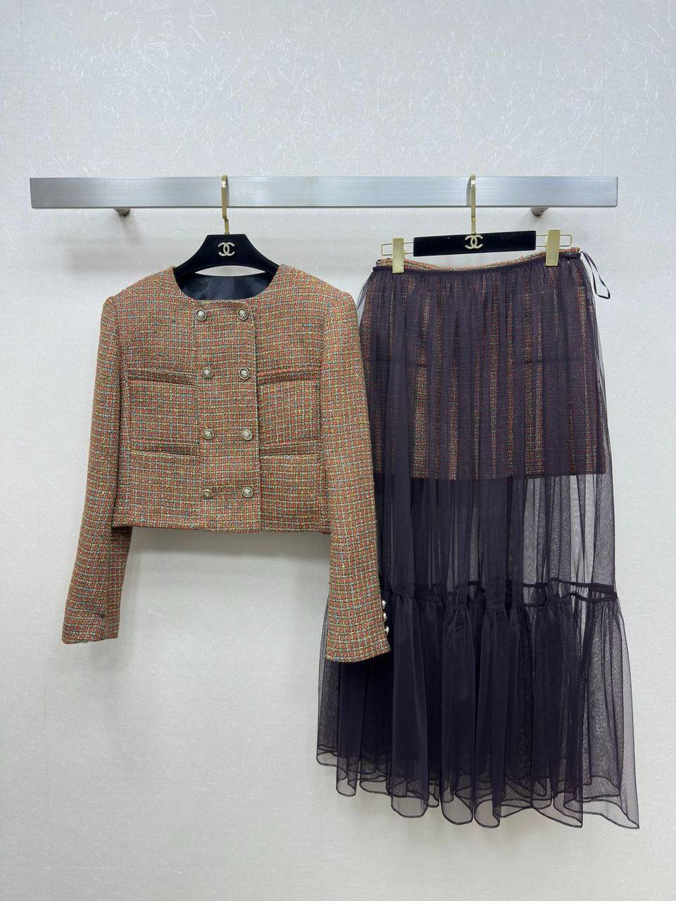 Этот женский костюм от Chanel – воплощение элегантности и стиля. Костюм включает в себя укороченный жакет и юбку, создавая изысканный и современный образ.