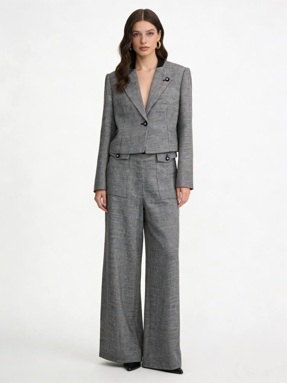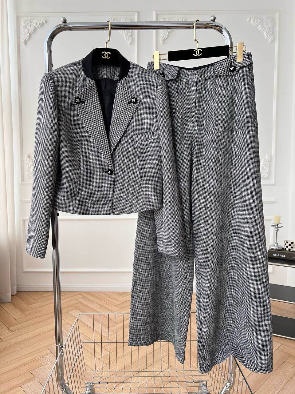 Элегантный женский костюм в стиле Chanel, состоящий из укороченного жакета и широких брюк, идеально подойдет для создания изысканного образа. Костюм выполнен в клетчатой расцветке с отделкой черного цвета, что придает ему особый шарм.