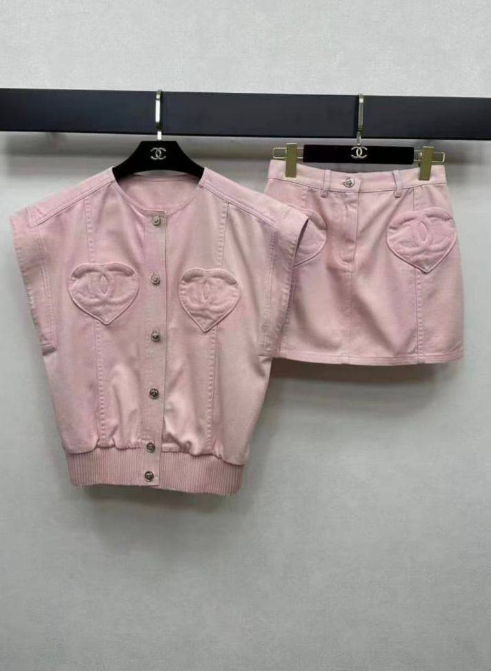 Костюм Chanel BMS-157108 - это стильный комплект, состоящий из куртки без рукавов и юбки. Выполненный в нежном розовом цвете, он идеально подойдет для создания романтичного и женственного образа.