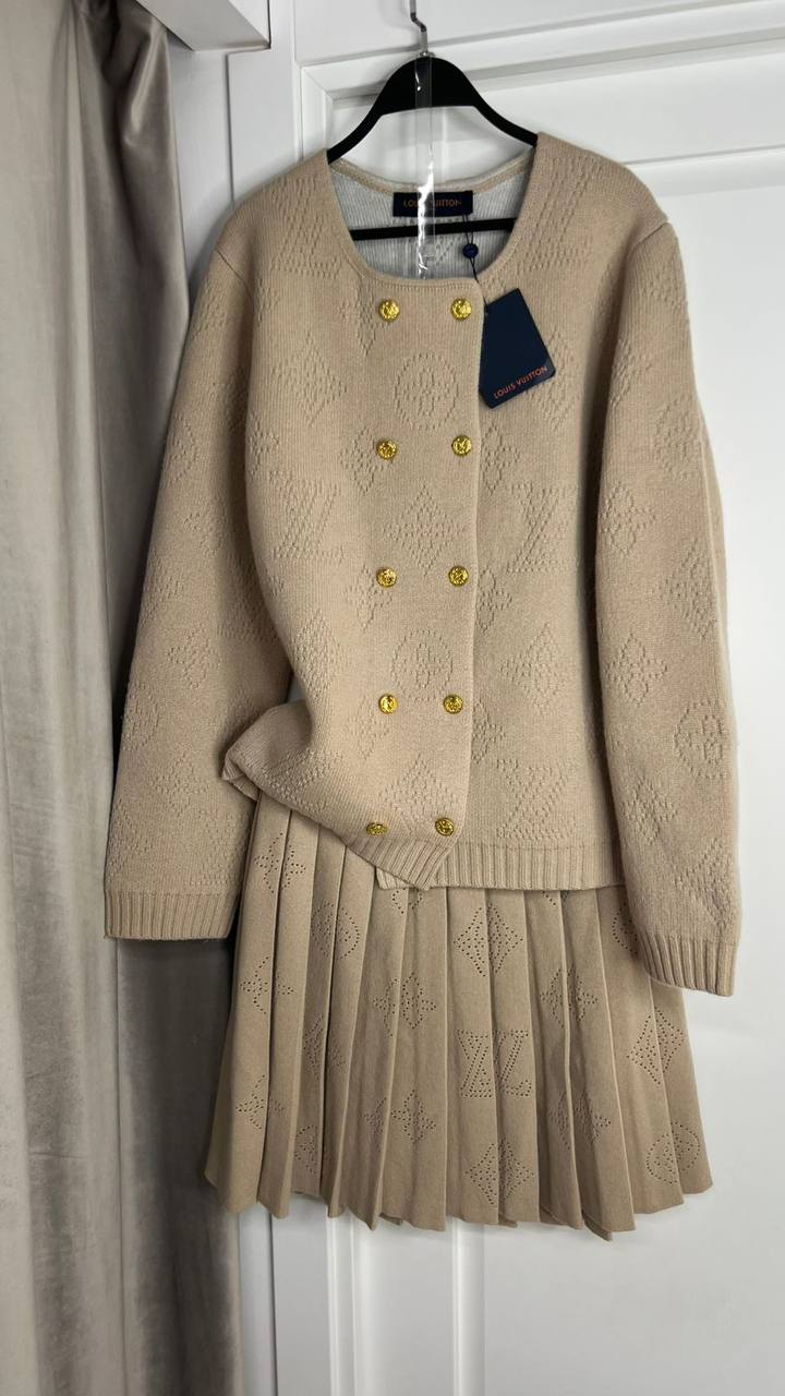 Костюм женский Louis Vuitton BMS-153410 выполнен в классическом стиле. Он состоит из жакета на пуговицах и юбки плиссе.