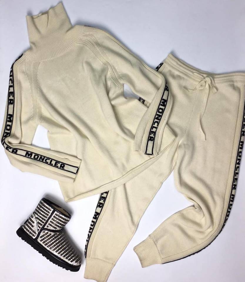 Костюм женский Moncler odj-7351 представлен в кремовом цвете, сочетая в себе элегантность и спортивный стиль. Высокий воротник и свободный крой свитера, а также удобные брюки с кулиской, делают этот костюм идеальным выбором для повседневной носки. Декоративная лента с логотипом бренда по бокам добавляет изделию узнаваемости.