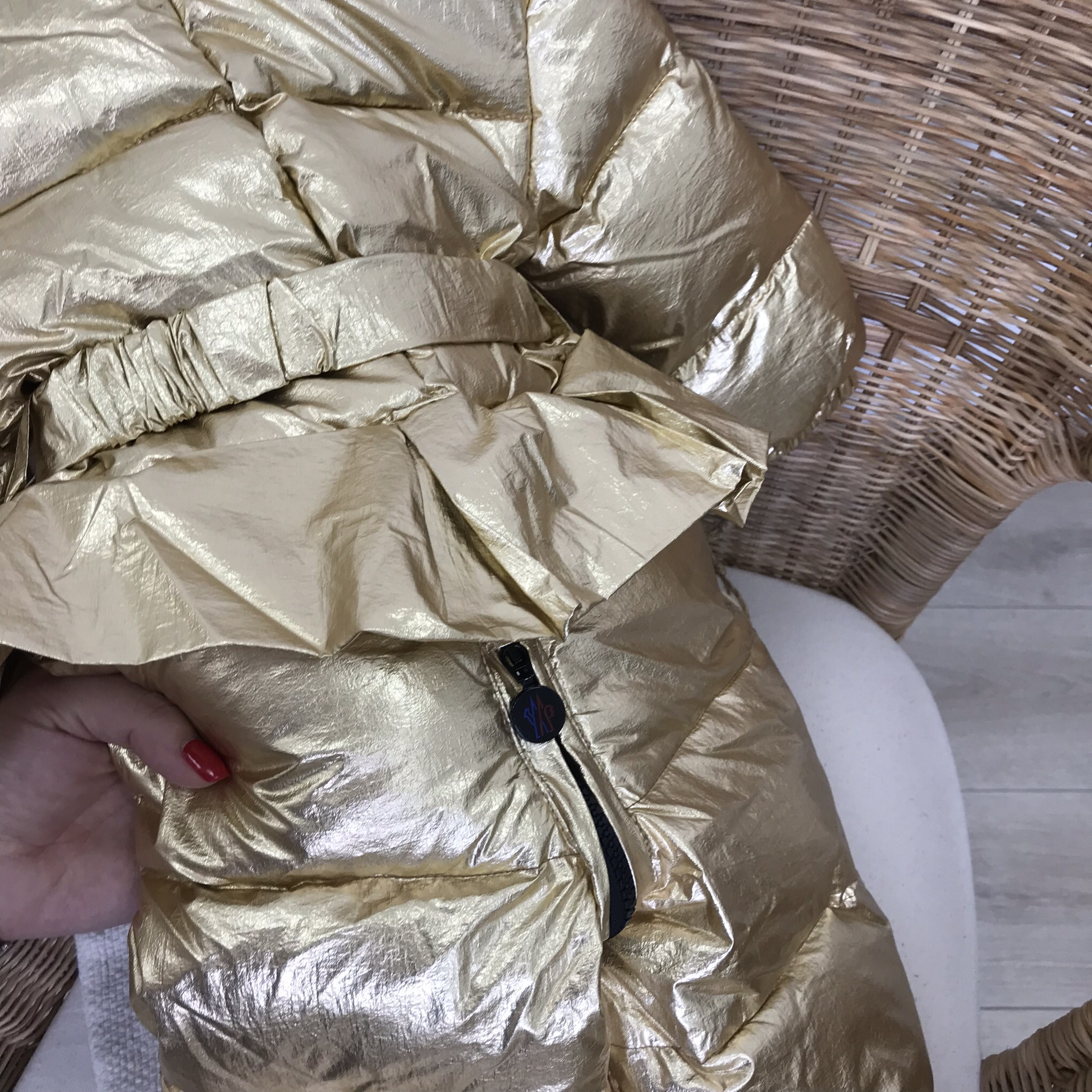 Блестящий золотой комбинезон Moncler BMS-41023 с объемным меховым воротником выглядит роскошно и стильно, идеально подходит для зимних прогулок и активного отдыха. Его глянцевая текстура и продуманный дизайн обеспечивают комфорт и защиту от холода.