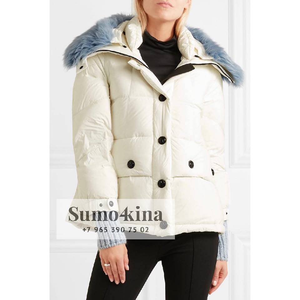 Стильная женская куртка Moncler BMS-28341 кремового цвета с объемным капюшоном, отороченным искусственным мехом небесно-голубого оттенка. Модель прямого кроя, дополненная крупными черными пуговицами, идеально подходит для создания элегантных повседневных образов в холодное время года.