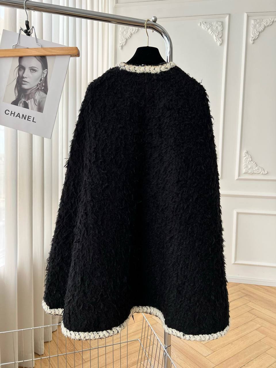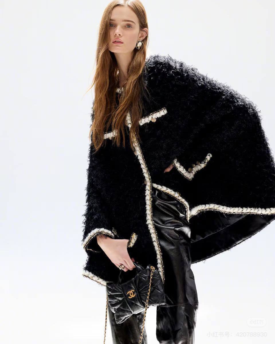 Изысканное пальто Chanel BMS-154347 - это воплощение элегантности и стиля. Классический черный цвет и фактурная ткань создают роскошный образ, а отделка контрастным кантом и золотистыми пуговицами добавляет шарма.
