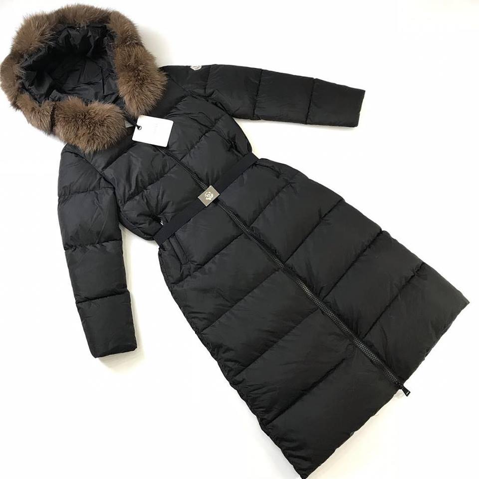 Стильное и теплое удлиненное пальто Moncler BMS-30814 черного цвета с меховой отделкой капюшона идеально подходит для холодной погоды. Стеганая фактура и пояс подчеркивают женственный силуэт, создавая элегантный образ.