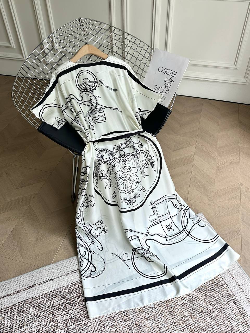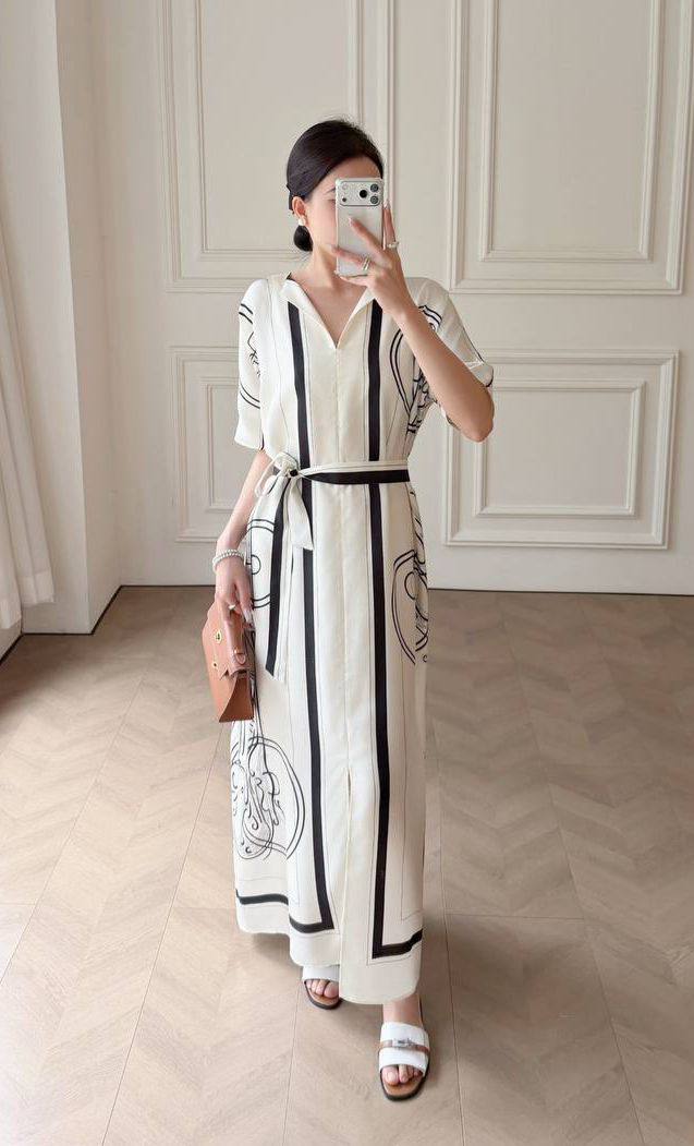 Платье Hermes BMS-156417 – это элегантное платье в пол с короткими рукавами, выполненное в светлых тонах с контрастными черными полосами и рисунками. Идеально подходит для создания женственного и стильного образа.