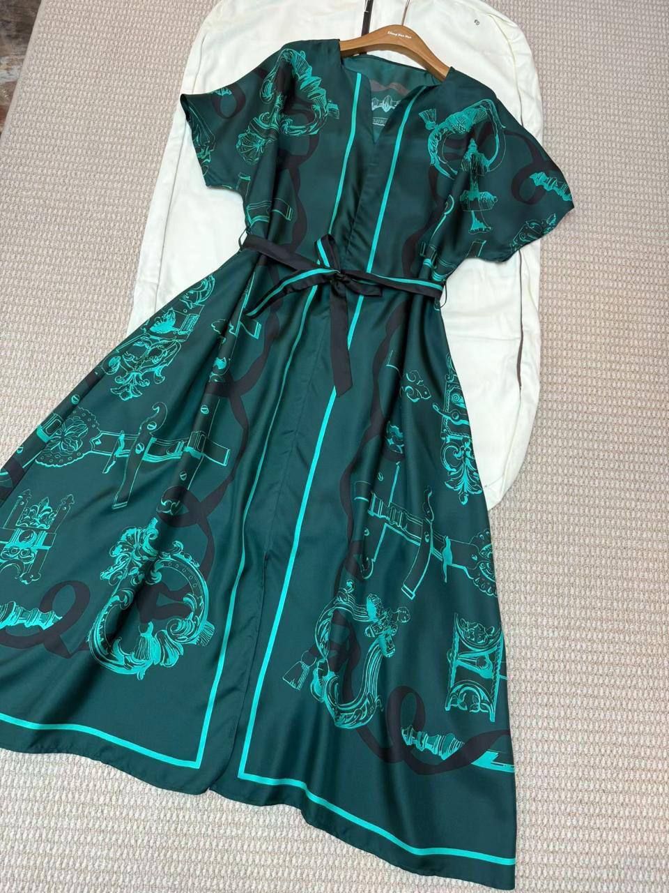 Платье Hermes BMS-157034 – это элегантное платье миди с короткими рукавами, выполненное в классическом стиле, которое подойдет для создания изысканного образа. Оно выделяется своим уникальным принтом и поясом, подчеркивающим талию.
