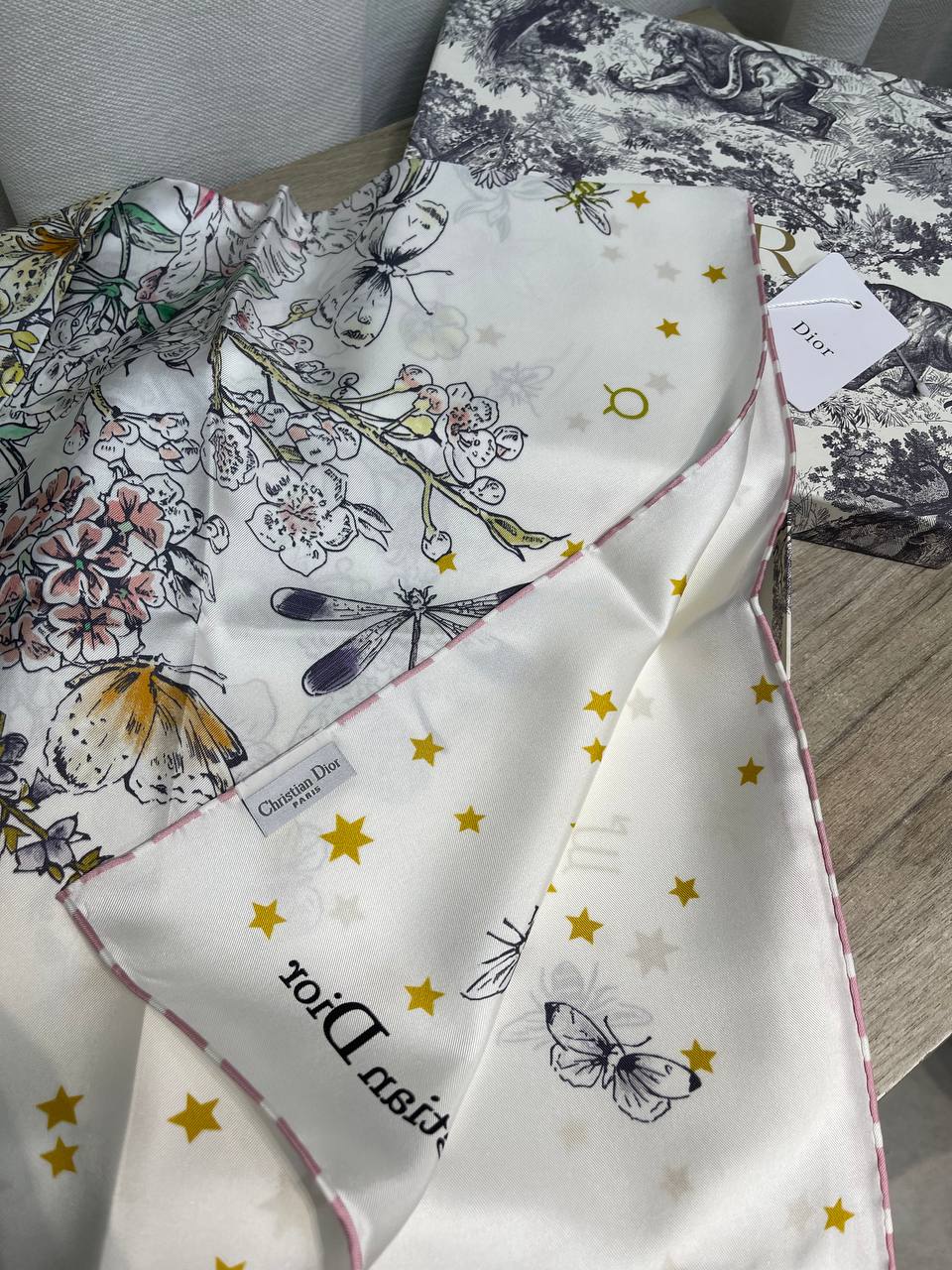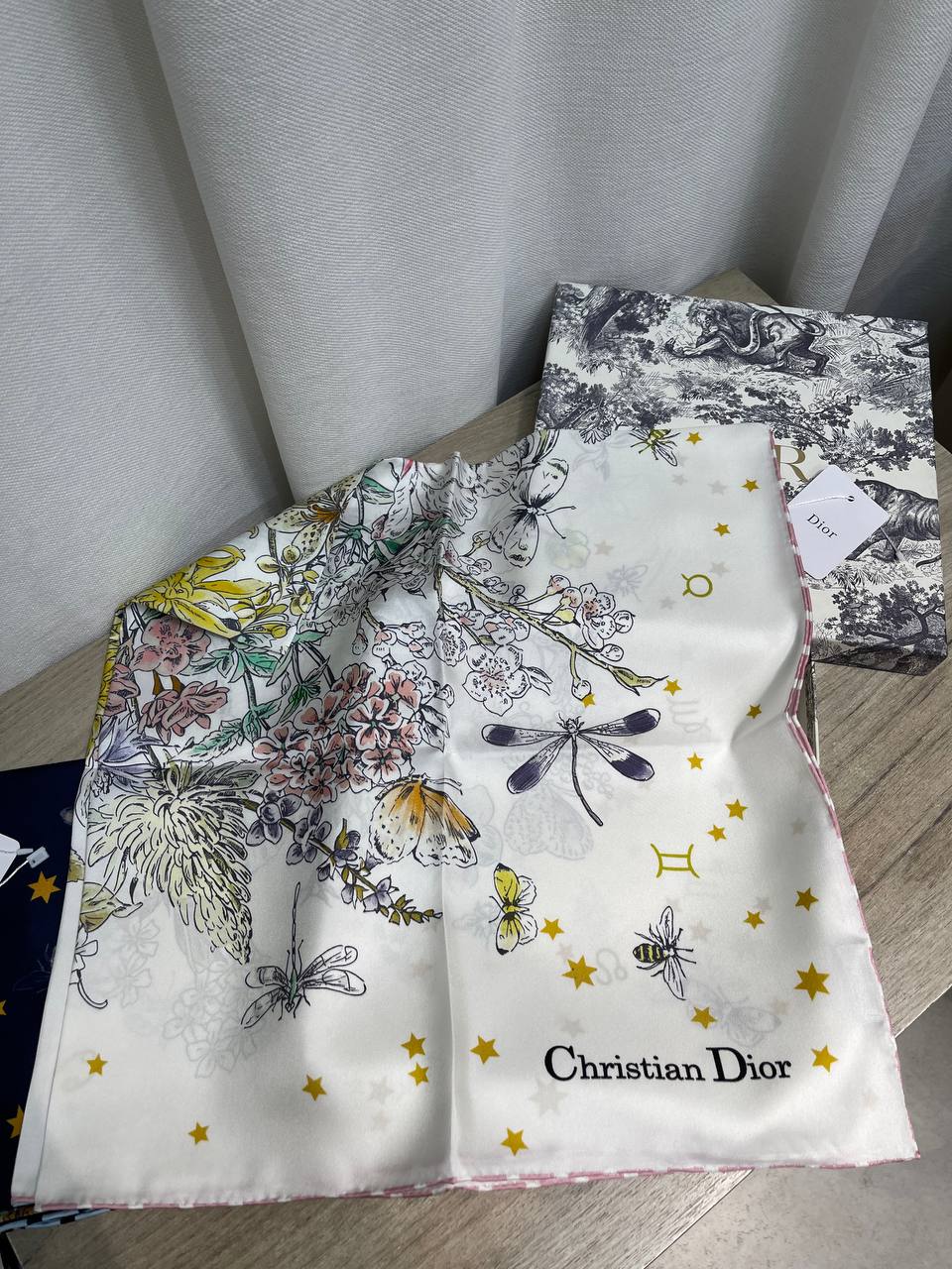 Платок Christian Dior BMS-155493 — это элегантный аксессуар, который добавит изысканности любому образу. Он отличается нежным дизайном с цветочными мотивами и изображением насекомых.