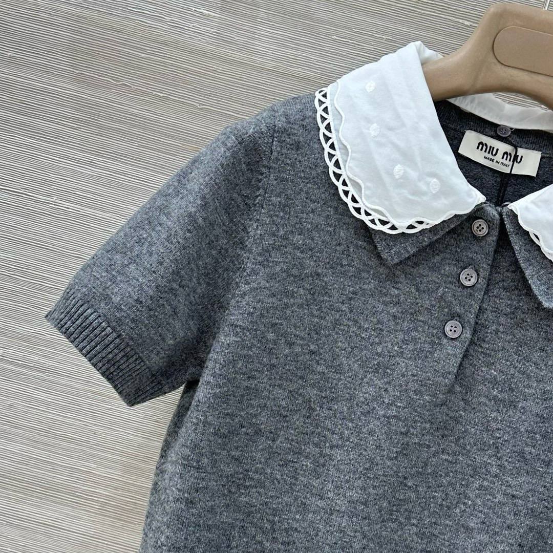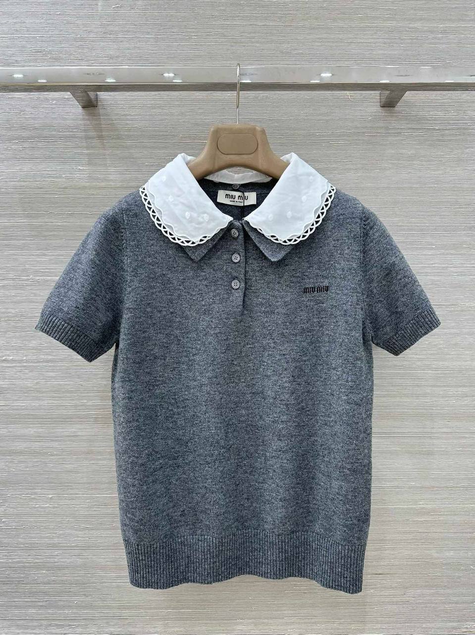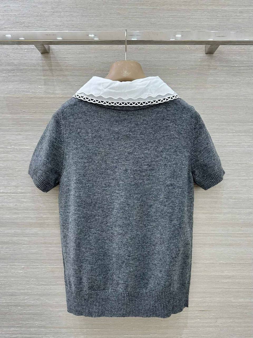 Поло Miu Miu BMS-154236 - стильное и элегантное решение для повседневного гардероба. Модель выполнена в сером цвете и дополнена контрастным белым воротником. Отлично сочетается с различными элементами одежды, создавая утонченный образ.