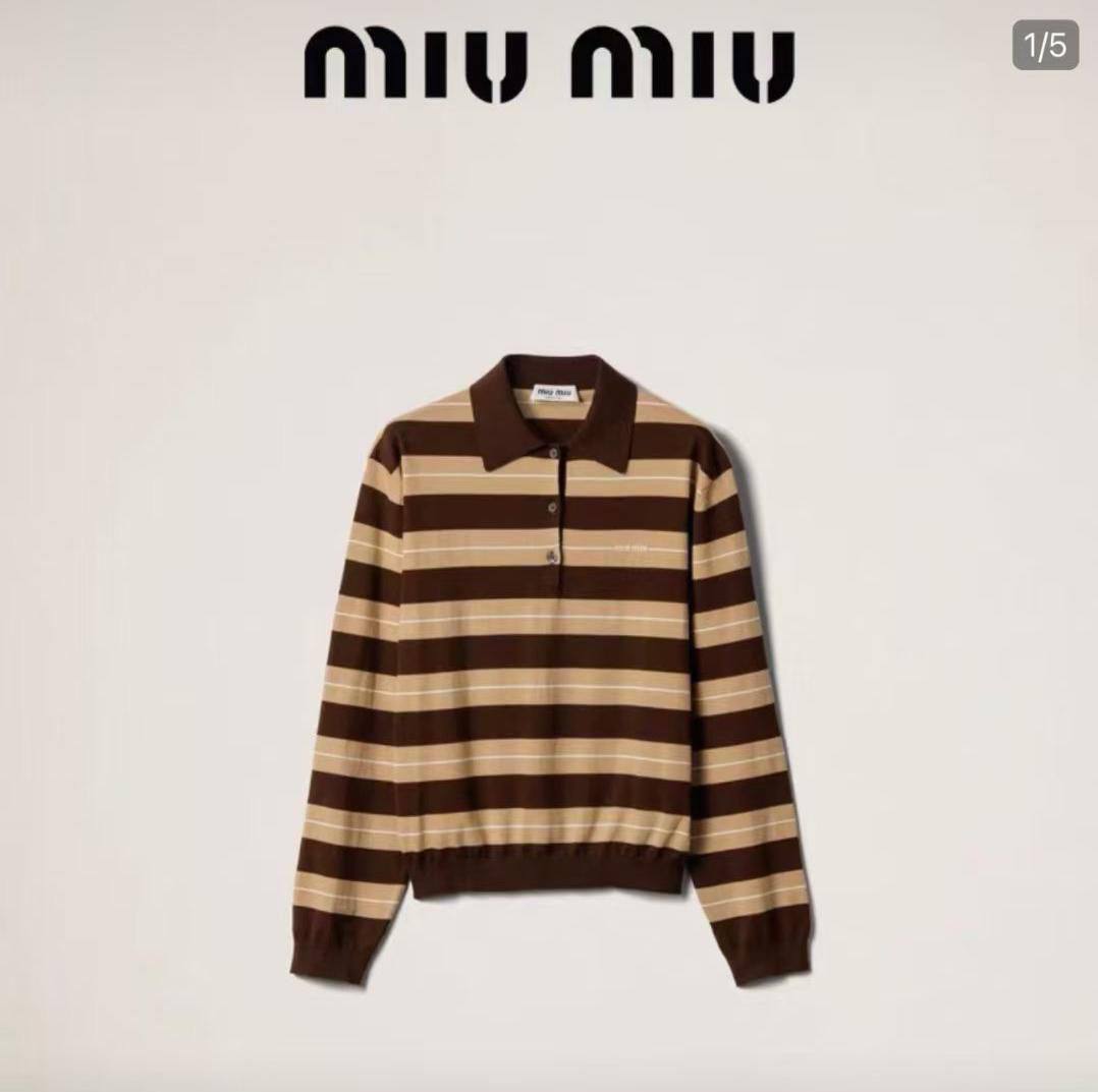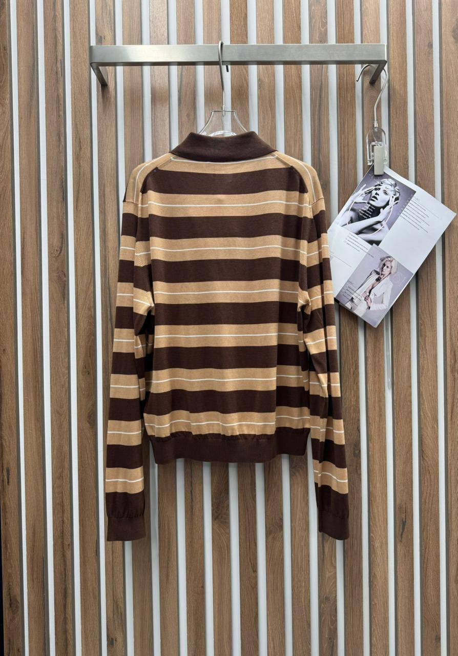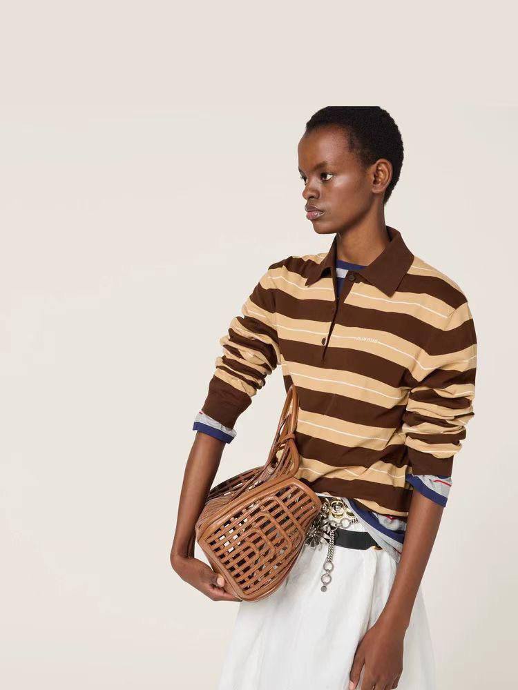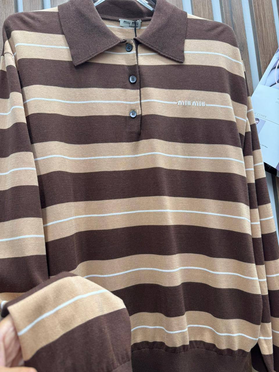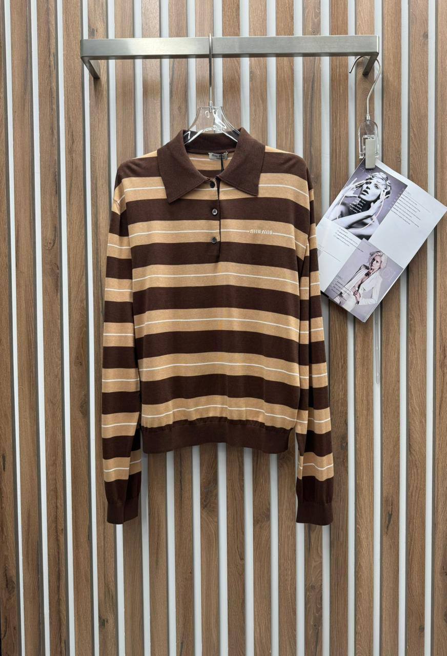 Поло Miu Miu BMS-156255 выполнено в стиле casual с длинными рукавами. Оригинальный дизайн с горизонтальными полосами разных оттенков коричневого и бежевого цветов.