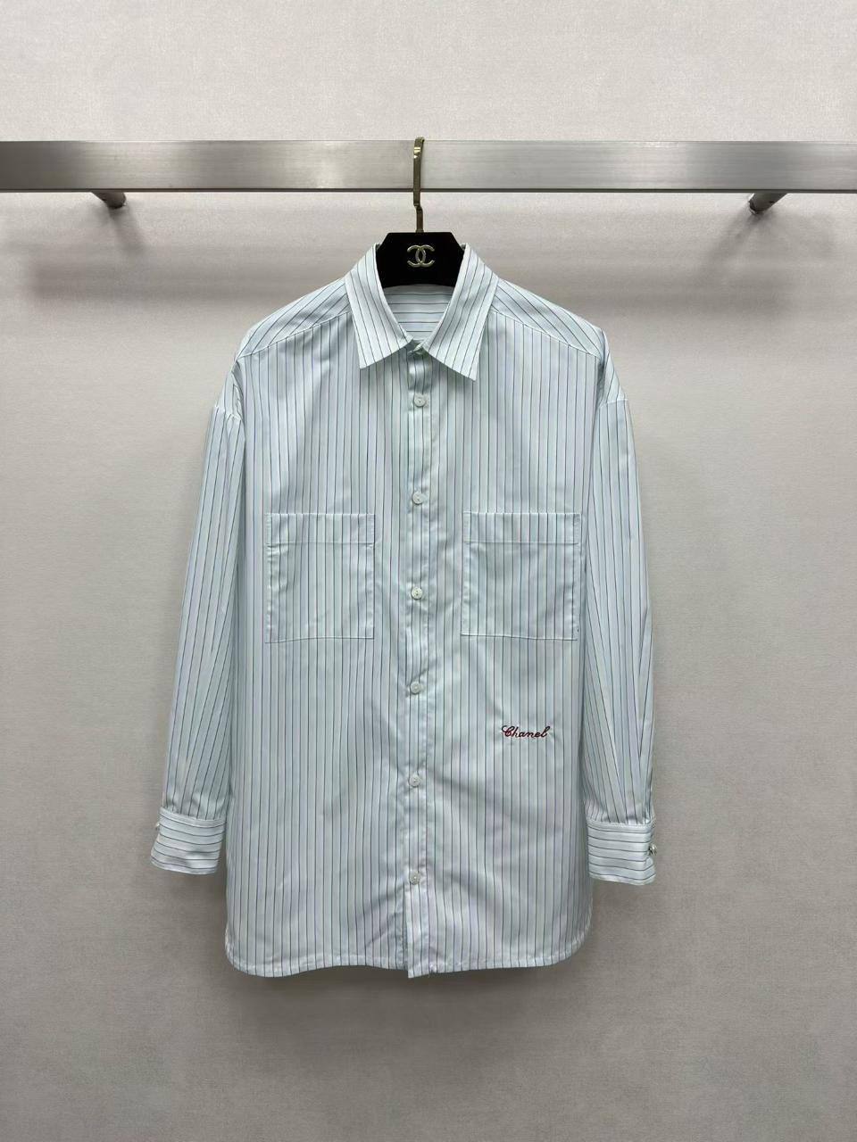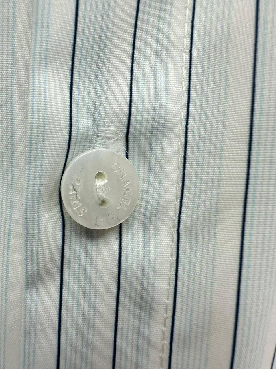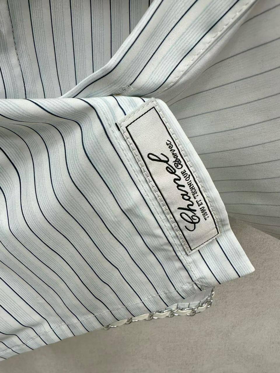 Рубашка Chanel BMS-156889 — это элегантный предмет гардероба, выполненный в классическом стиле с современными акцентами. Прямой силуэт, полосатый узор и наличие накладных карманов создают стильный и непринужденный образ.