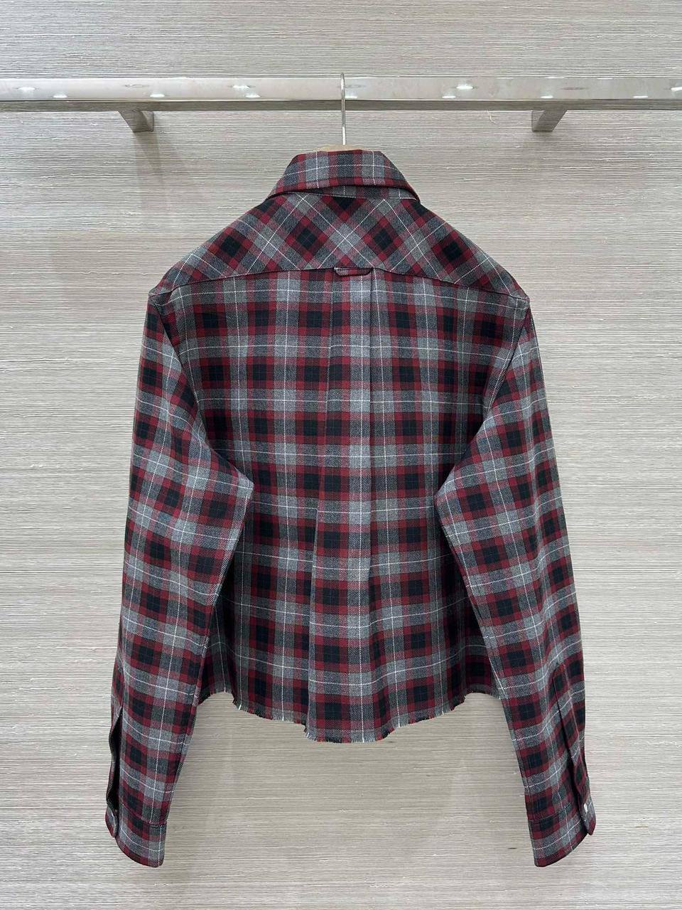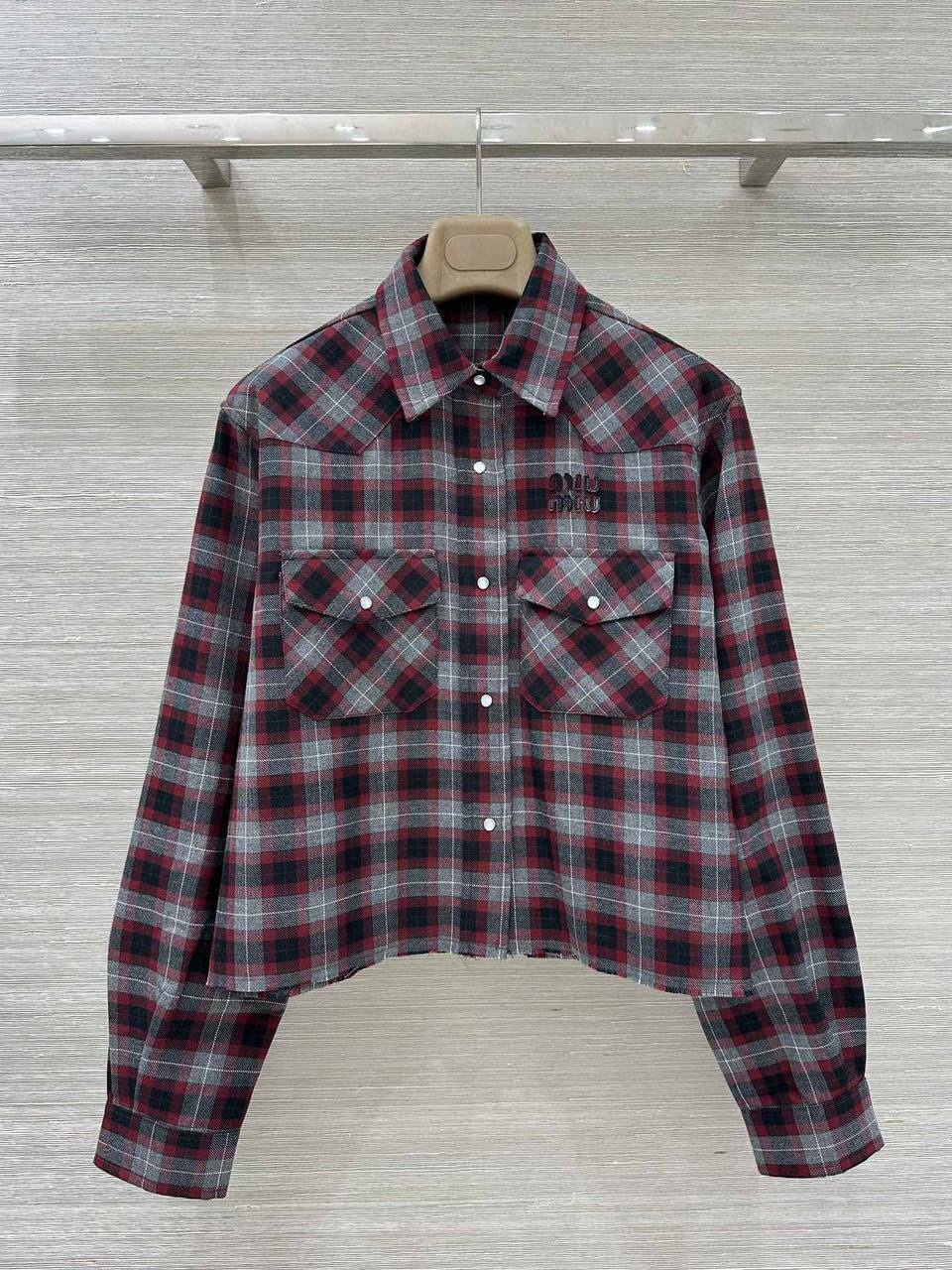 Рубашка Miu Miu BMS-152108 выполнена в укороченном крое с длинными рукавами и отложным воротником. Модель в клетку с двумя нагрудными карманами отлично подойдет для создания стильного повседневного образа.