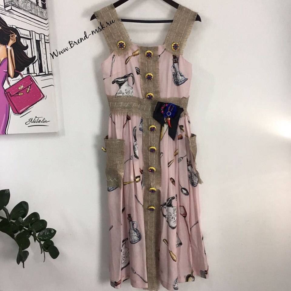 Сарафан odj-822 – это стильный женский сарафан в нежно-розовом цвете с оригинальным принтом кухонной утвари. Модель имеет свободный крой, декорирована крупными пуговицами и контрастной тесьмой, что придает ей особый шарм и подчеркивает индивидуальность. Этот сарафан идеально подойдет для создания непринужденных летних образов.