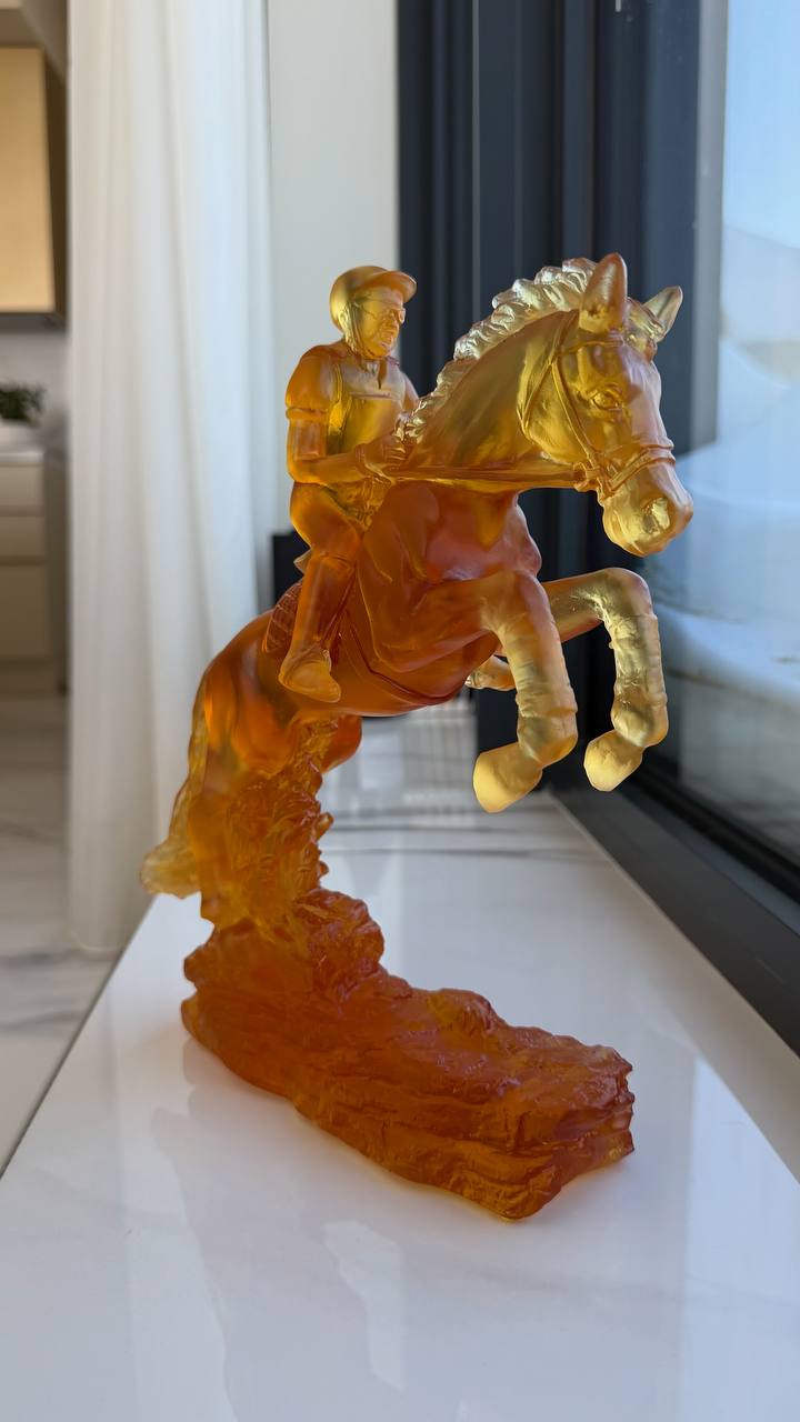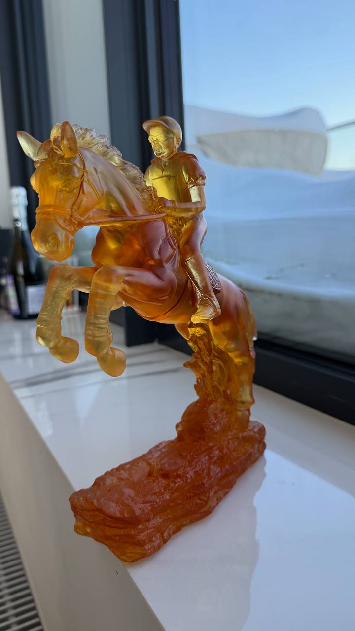 Статуэтка Daum BMS-152253 – это изысканное произведение искусства, выполненное в янтарных тонах. Она изображает всадника на вздыбленном коне, символизируя силу и грацию.