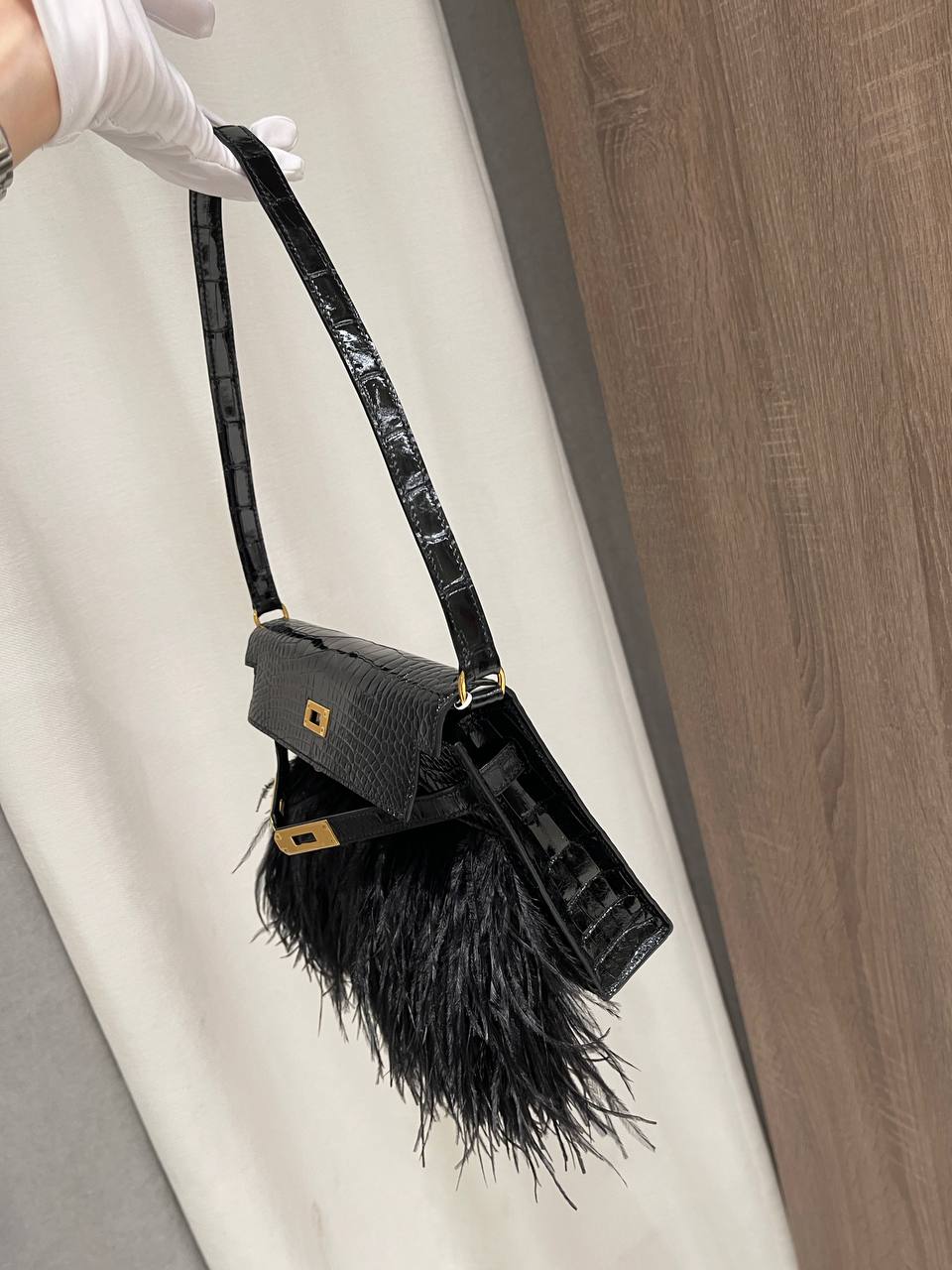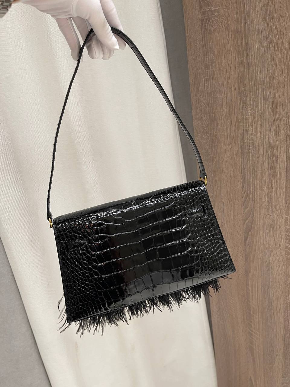 Сумка женская Kelly Elan Noir Alligator Hermes BMS-150398 - элегантный аксессуар, сочетающий в себе классическую форму и современные детали. Роскошная отделка из кожи аллигатора и декоративные перья делают эту сумку ярким акцентом в любом образе.