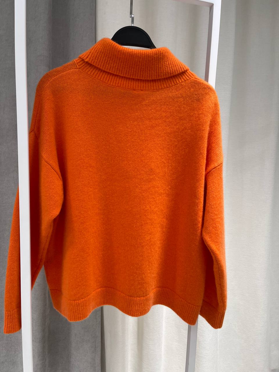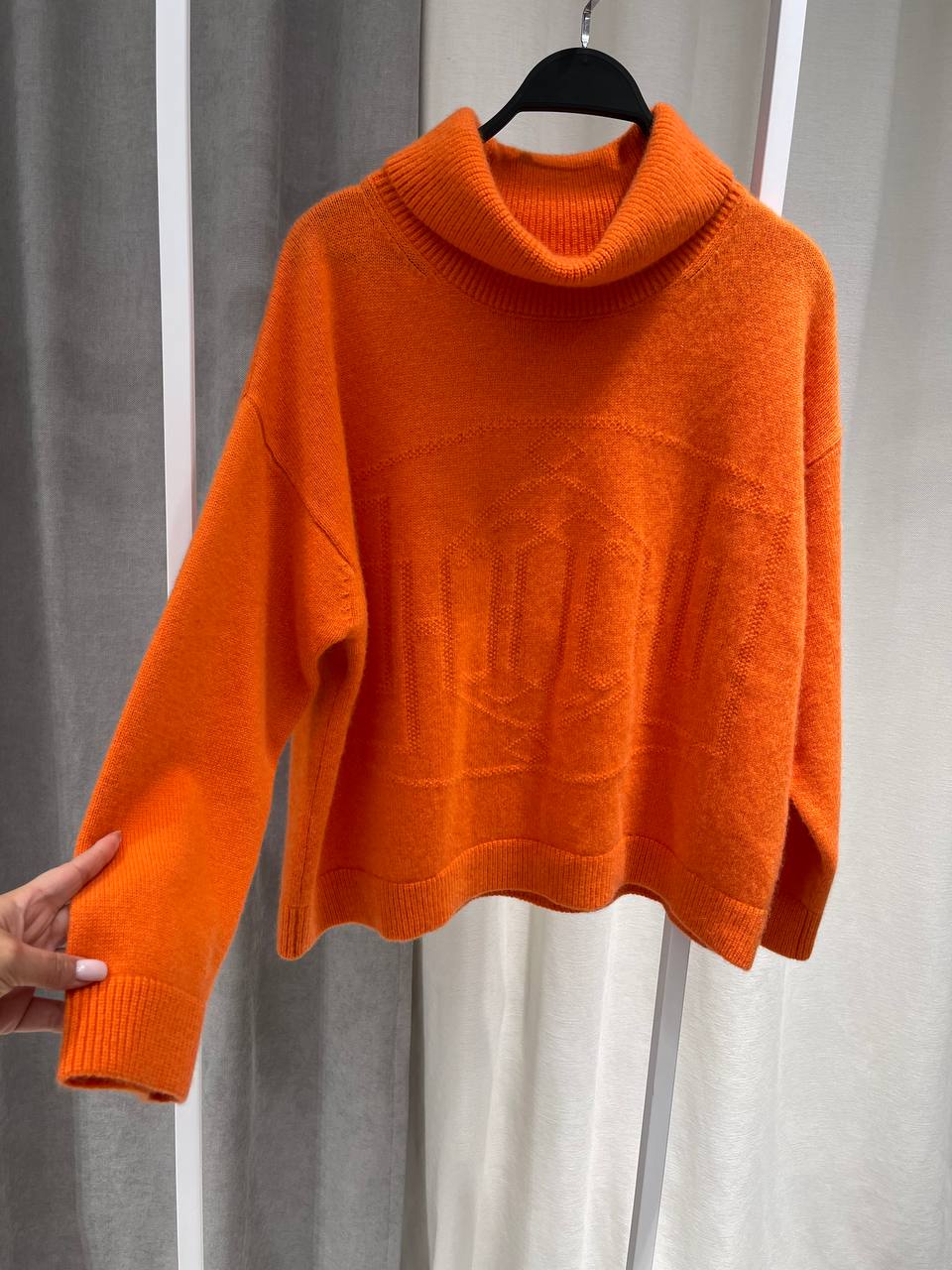 Свитер Hermes BMS-147763 - это стильный предмет гардероба, который сочетает в себе элегантность и комфорт. Свитер оранжевого цвета с высоким воротником-стойкой, который придаёт образу изысканность.
