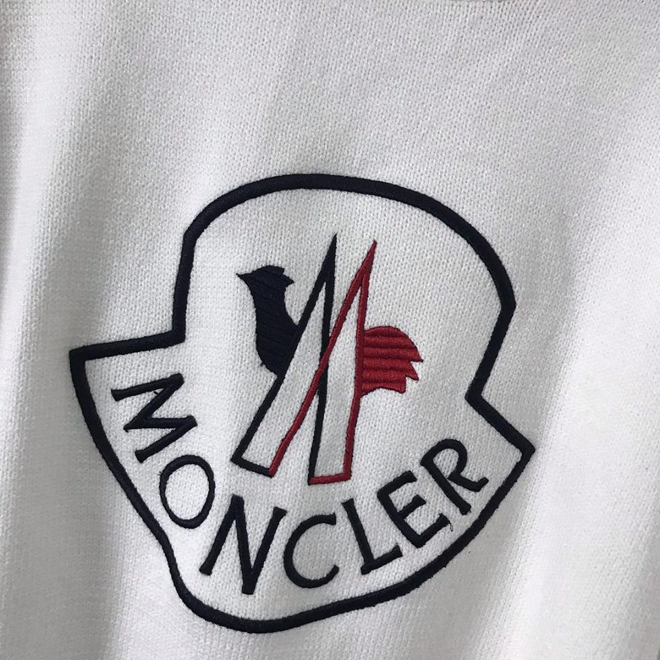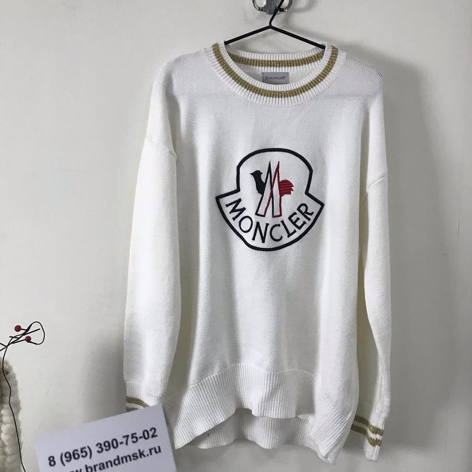 Этот элегантный женский свитер Moncler (артикул BMS-31289) в белом цвете с контрастным золотистым кантом на воротнике и манжетах станет стильным дополнением вашего гардероба. Объемный логотип бренда, выполненный в характерных для Moncler черных, красных и синих тонах, придает свитеру узнаваемость и приверженность к спортивному шику.