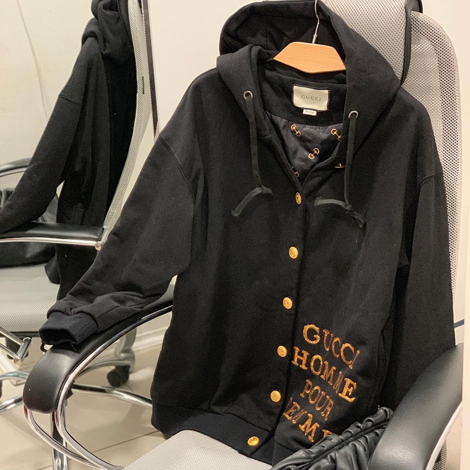 Толстовка женская BMS-44694 от Gucci — стильная черная модель с капюшоном и золотистой фурнитурой, украшенная объемной вышивкой. Эта толстовка сочетает в себе комфорт и элегантность, идеально подходя для создания расслабленных, но эффектных образов.