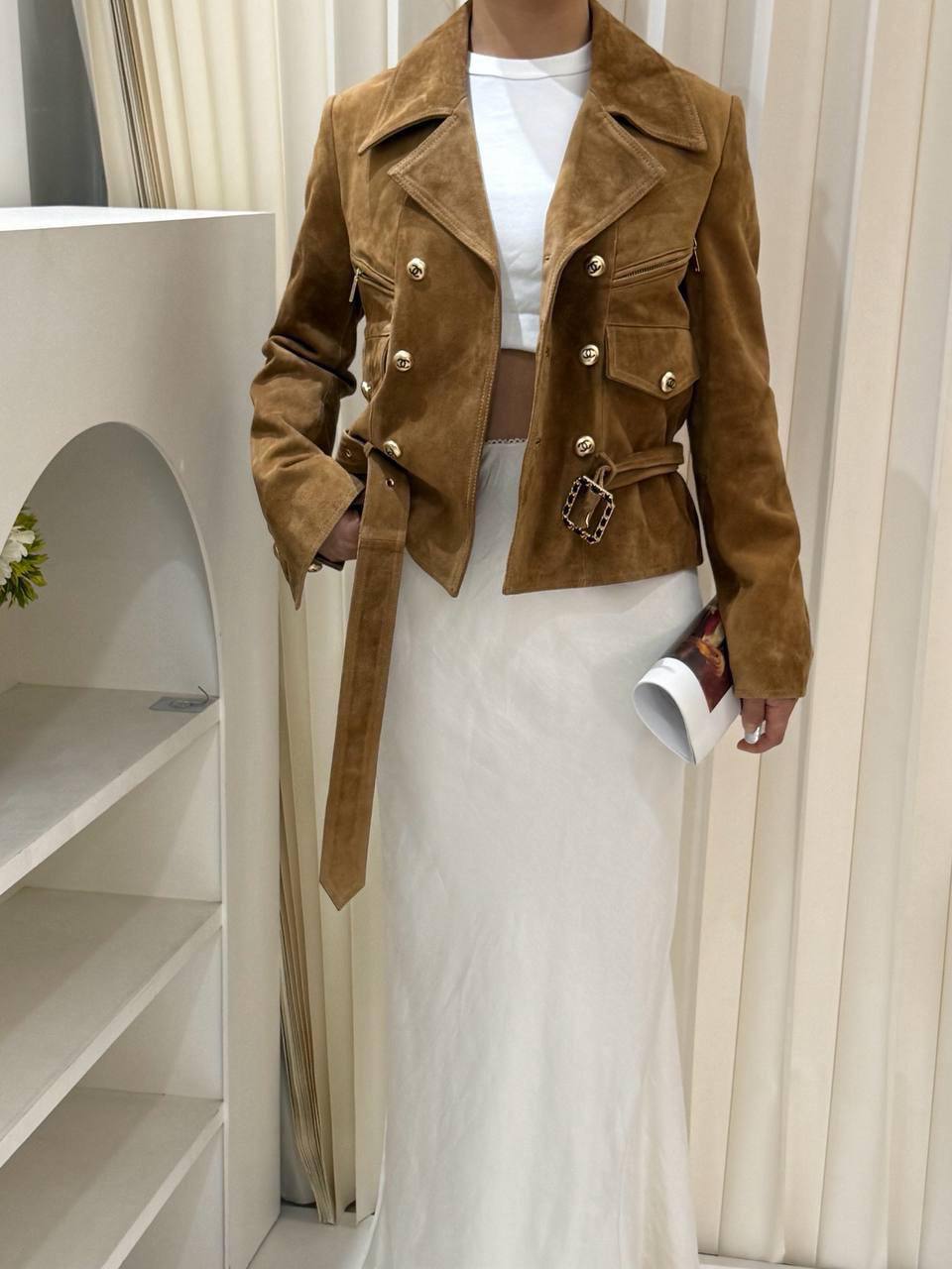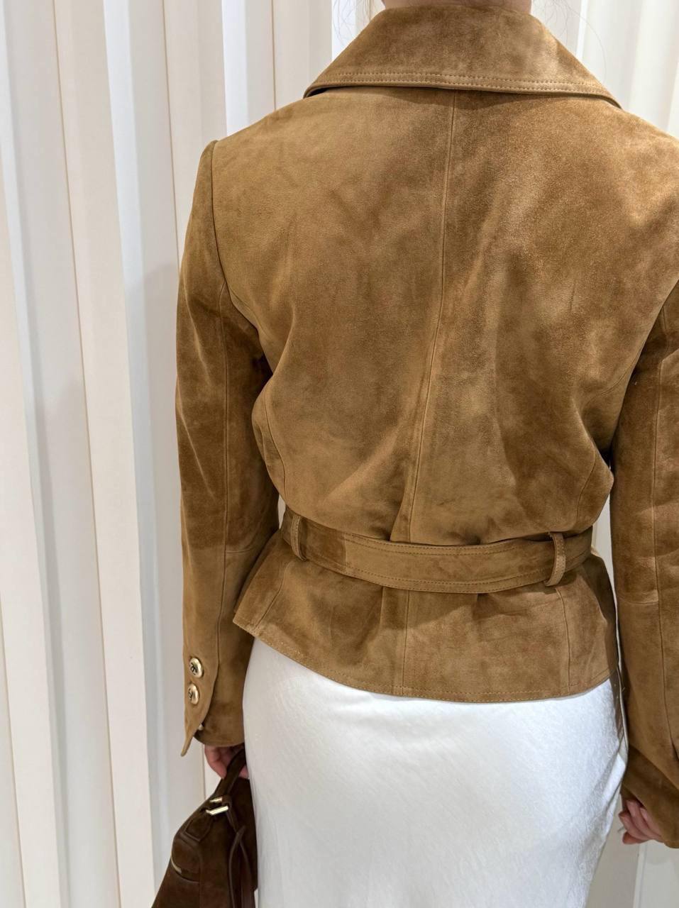 Замшевая куртка BMS-156211 – стильная верхняя одежда, которая подчеркнет индивидуальность и добавит изысканности образу. Укороченный крой и пояс выгодно выделяют талию.